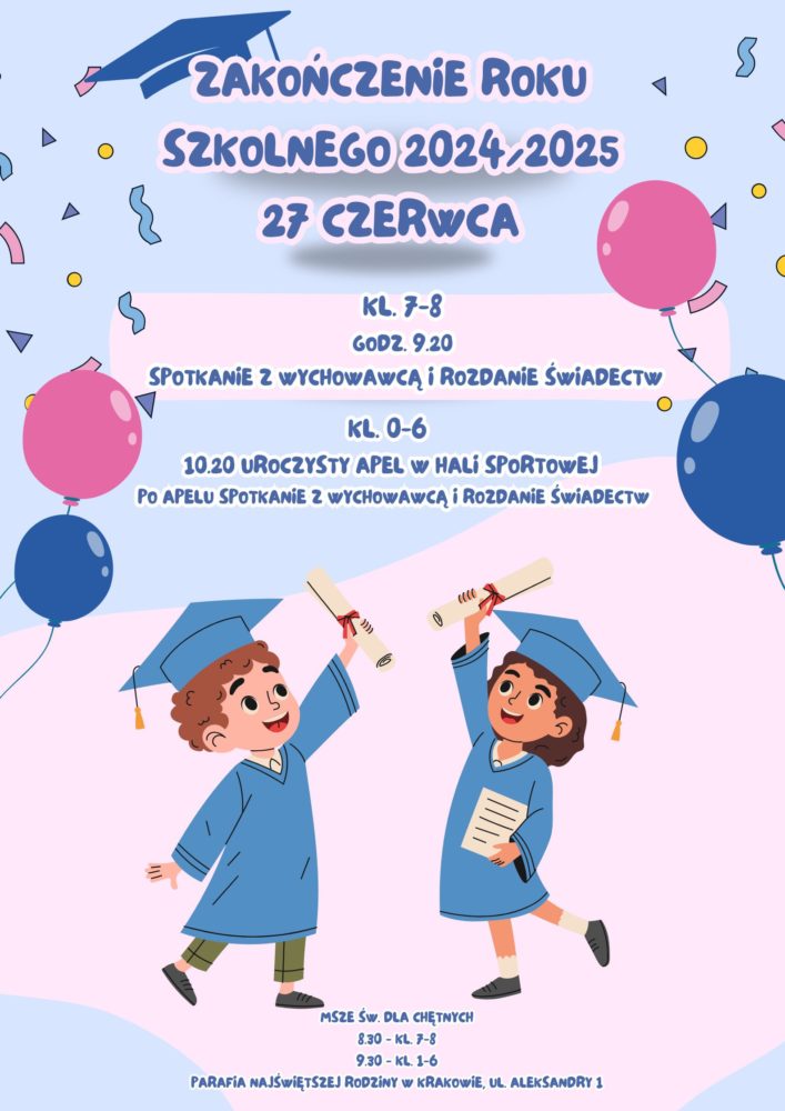 Zakończenie roku szkolnego 2024/2025- wykaz sal dla poszczególnych klas