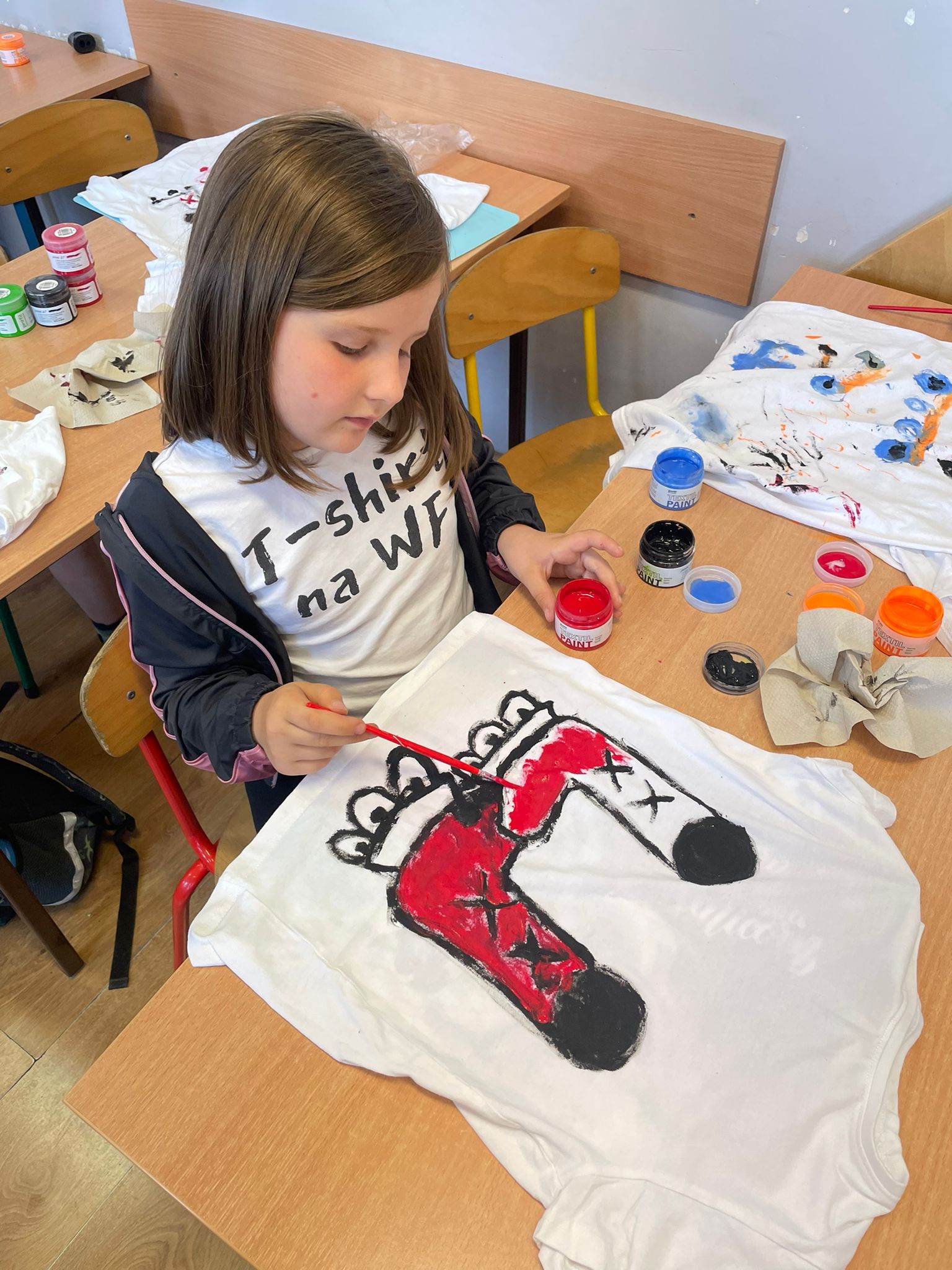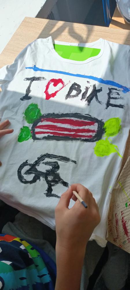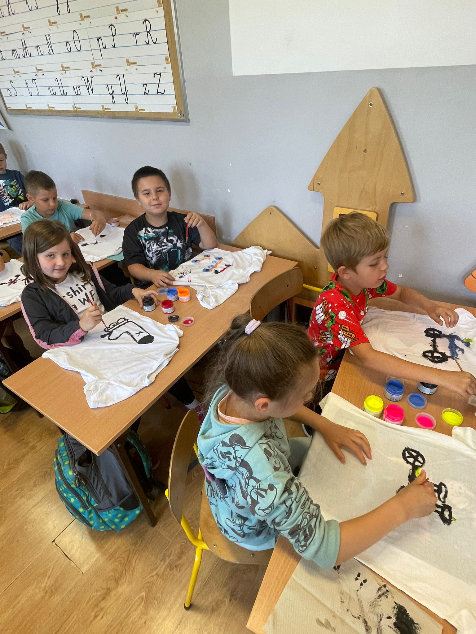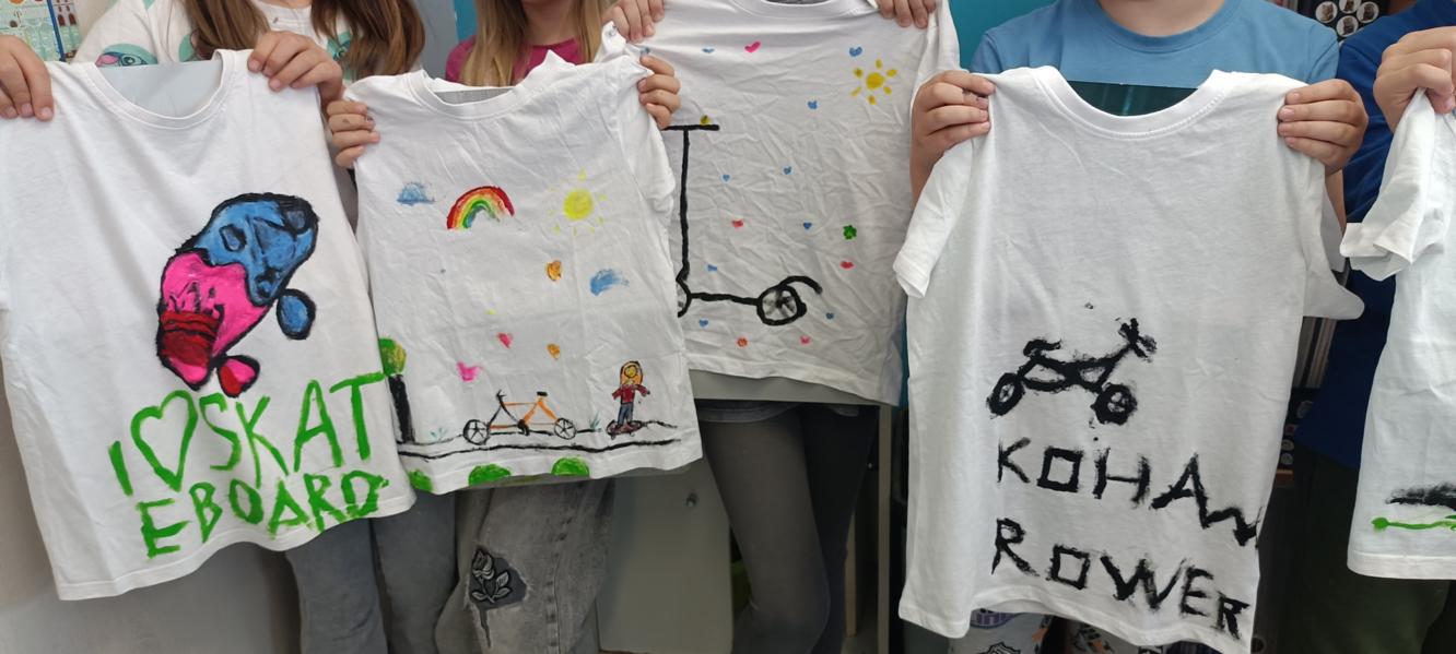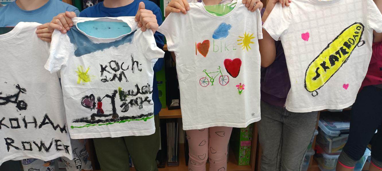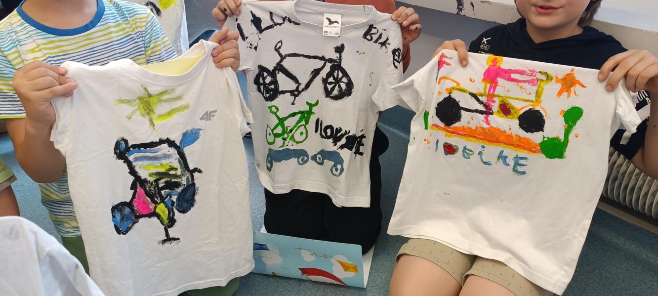 W maju i czerwcu uczniowie klas pierwszych  w ramach projektu STARS – Rowerem do szkoły, malowali koszulki (t-shirty) farbkami do tkanin, tworząc kolorowe motywy rowerów, hulajnóg, rolek i deskorolek. Inicjatywa promowała aktywność fizyczną i proekologiczną postawę, podkreślając znaczenie ruchu i ochrony środowiska. Dzieci chętnie uczestniczyły  w warsztatach, co zaowocowało bardzo kreatywnymi i pomysłowymi projektami.