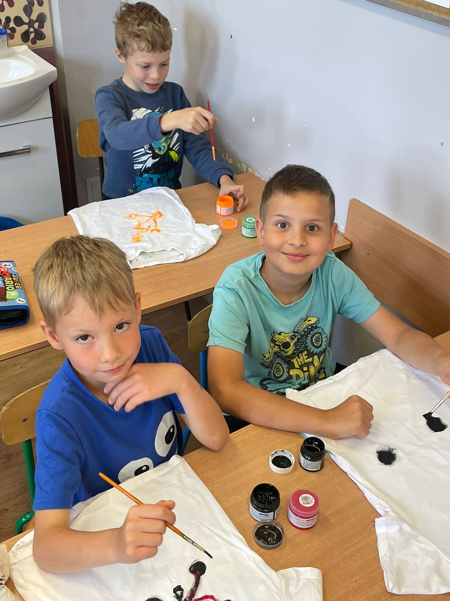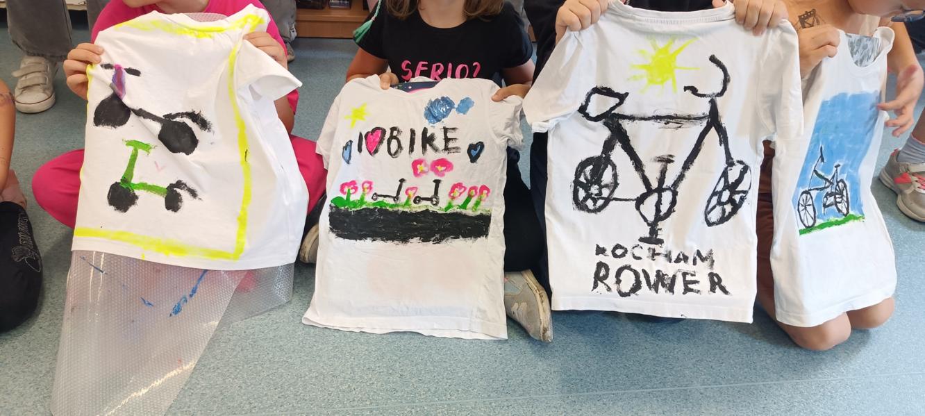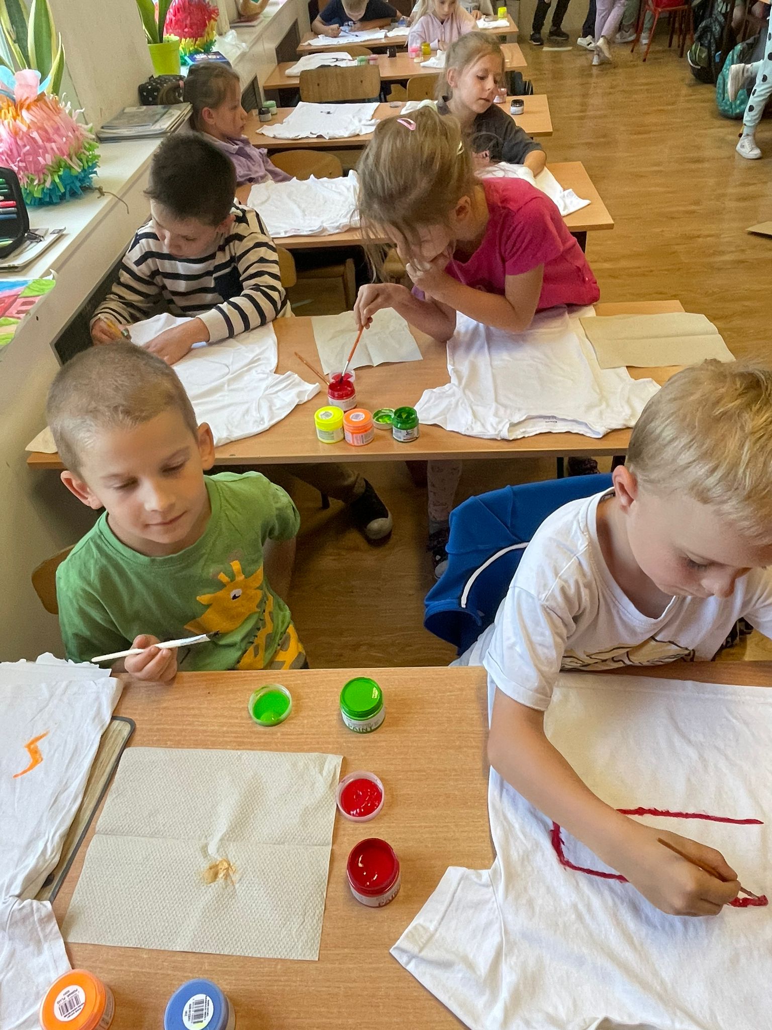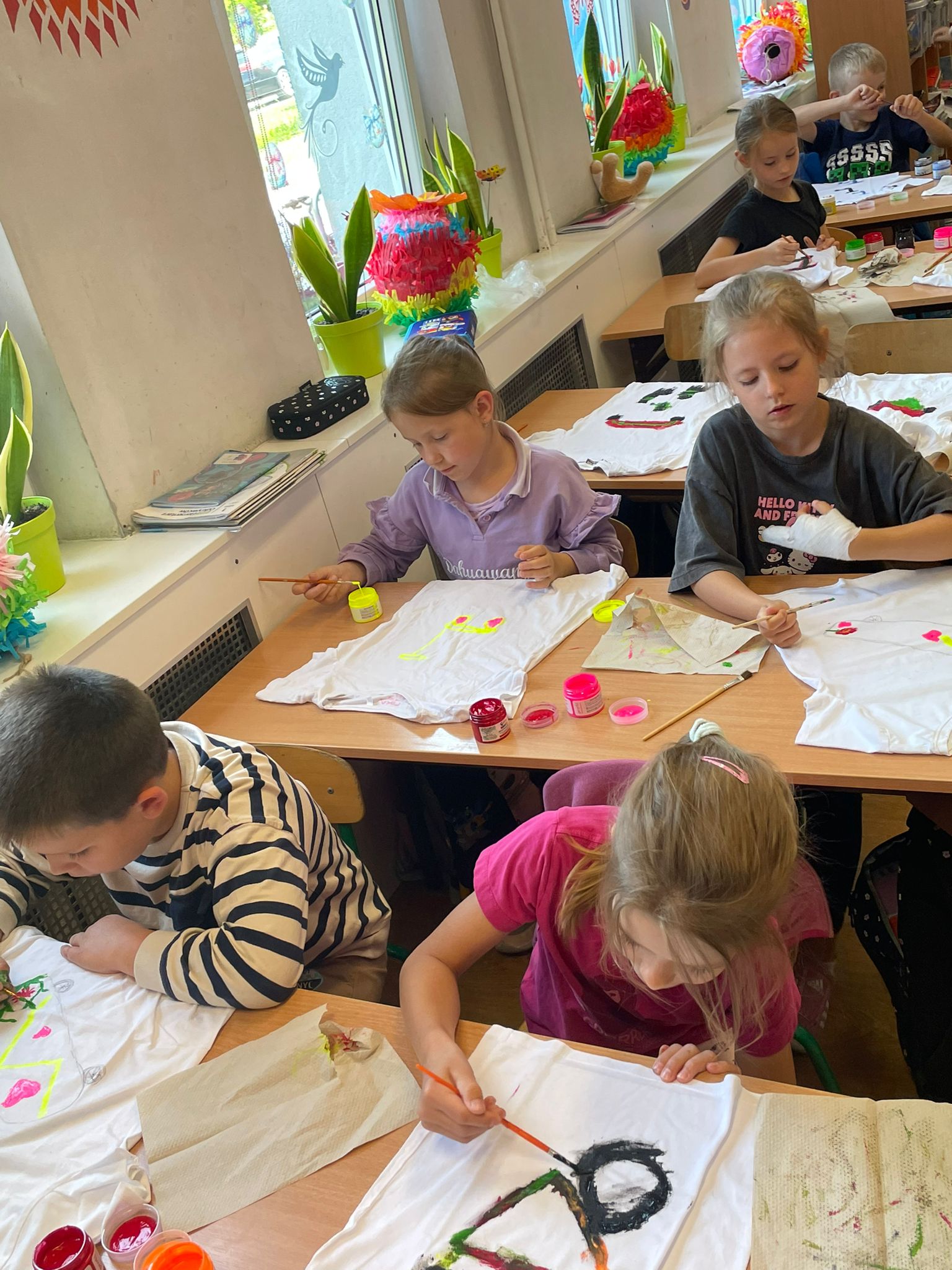 W maju i czerwcu uczniowie klas pierwszych  w ramach projektu STARS – Rowerem do szkoły, malowali koszulki (t-shirty) farbkami do tkanin, tworząc kolorowe motywy rowerów, hulajnóg, rolek i deskorolek. Inicjatywa promowała aktywność fizyczną i proekologiczną postawę, podkreślając znaczenie ruchu i ochrony środowiska. Dzieci chętnie uczestniczyły  w warsztatach, co zaowocowało bardzo kreatywnymi i pomysłowymi projektami.
