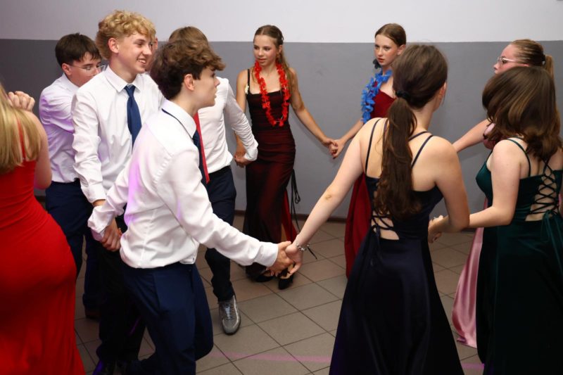 W czasie wieczoru wybrzmiały także piękne słowa podziękowań. Uczniowie przygotowali wzruszające dedykacje dla dyrekcji, wychowawców i nauczycieli – dziękując za trud, cierpliwość, wsparcie i motywację, jakie otrzymywali przez wszystkie lata nauki. Szczególne wyrazy uznania i wdzięczności popłynęły w stronę rodziców, którzy z ogromnym zaangażowaniem zorganizowali to wydarzenie – ich pomoc, kreatywność i serce włożone w przygotowanie balu sprawiły, że stał się on niezapomnianym przeżyciem dla wszystkich.