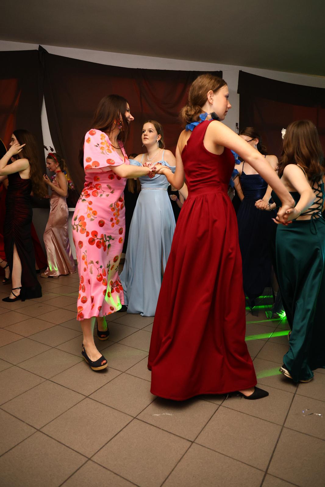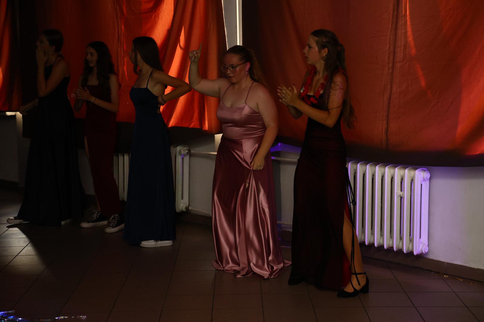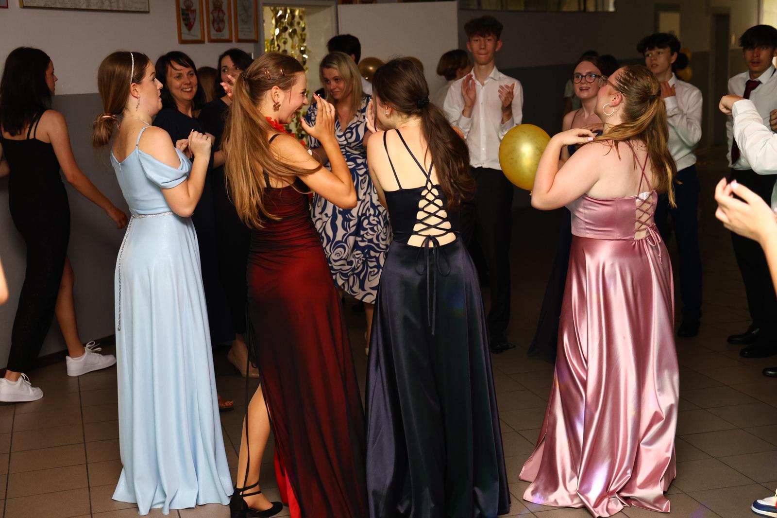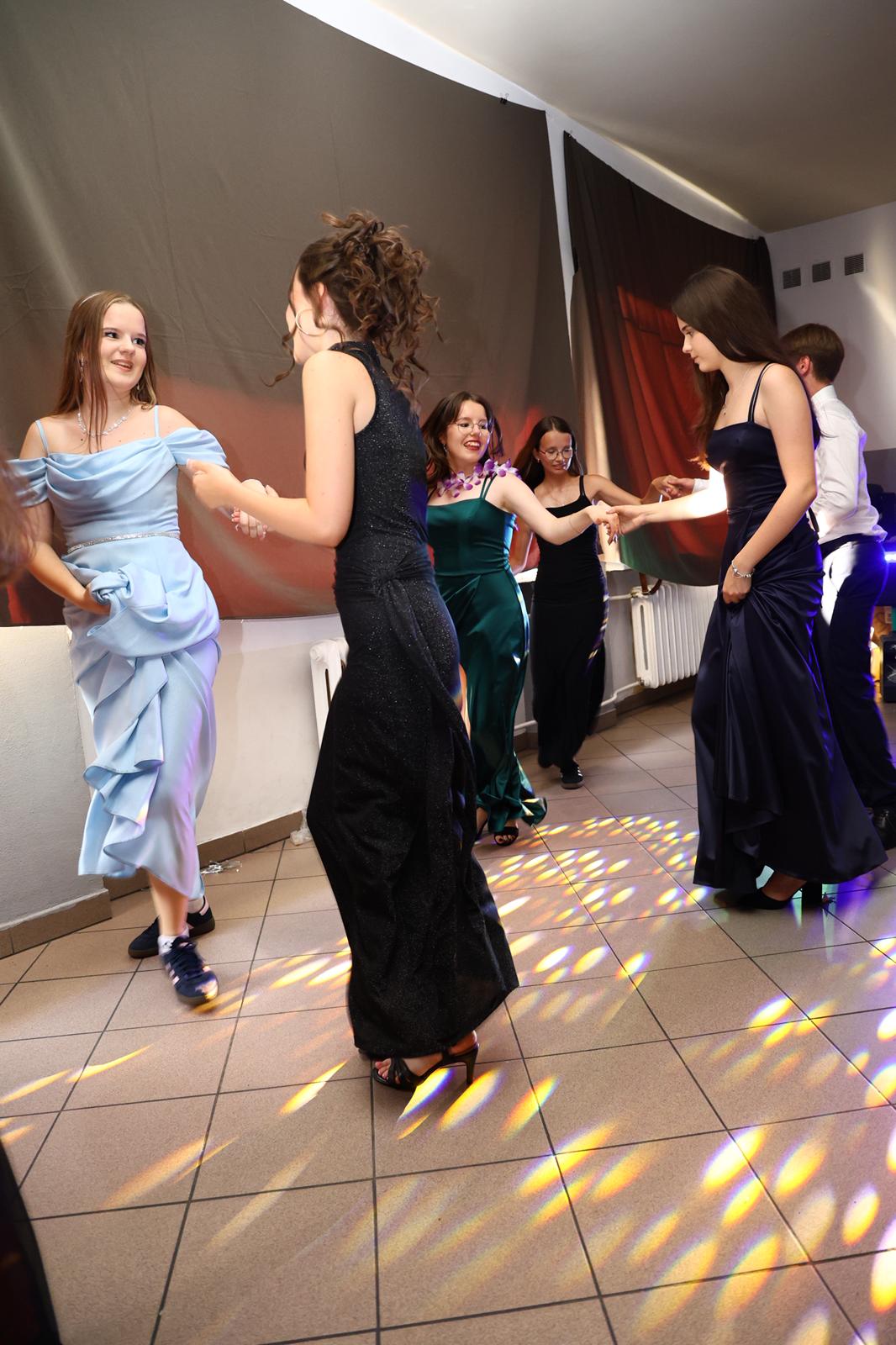W czasie wieczoru wybrzmiały także piękne słowa podziękowań. Uczniowie przygotowali wzruszające dedykacje dla dyrekcji, wychowawców i nauczycieli – dziękując za trud, cierpliwość, wsparcie i motywację, jakie otrzymywali przez wszystkie lata nauki. Szczególne wyrazy uznania i wdzięczności popłynęły w stronę rodziców, którzy z ogromnym zaangażowaniem zorganizowali to wydarzenie – ich pomoc, kreatywność i serce włożone w przygotowanie balu sprawiły, że stał się on niezapomnianym przeżyciem dla wszystkich.