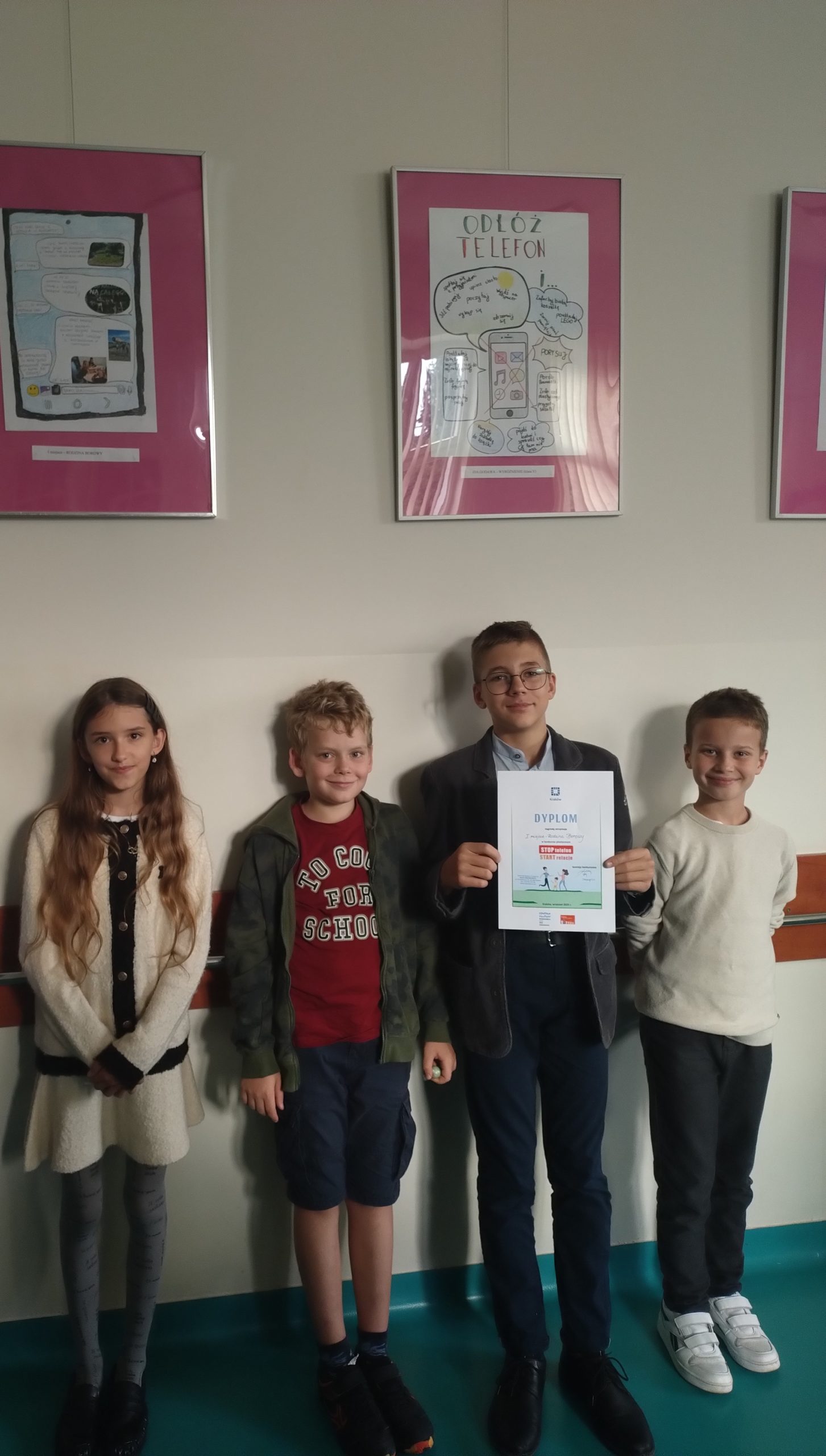 16 września 2025 r. w centrum Kultury Podgórza – Klub Soboniowice odbyło się uroczyste wręczenie nagród laureatom gminnego konkursu „Stop telefon – włącz relacje”, którego organizatorem byli: Centrum Kultury Podgórza – Klub Soboniowice oraz Pełnomocnik Prezydenta Miasta Krakowa ds rodziny. Spośród 186 zgłoszonych prac, aż 8 uczniów naszej szkoły zostało docenionych.