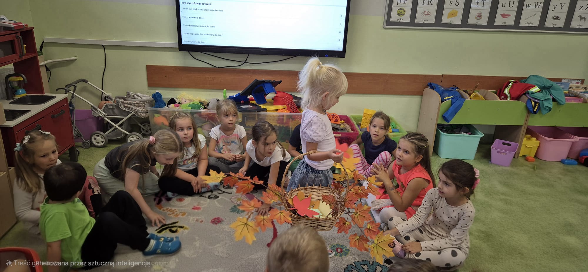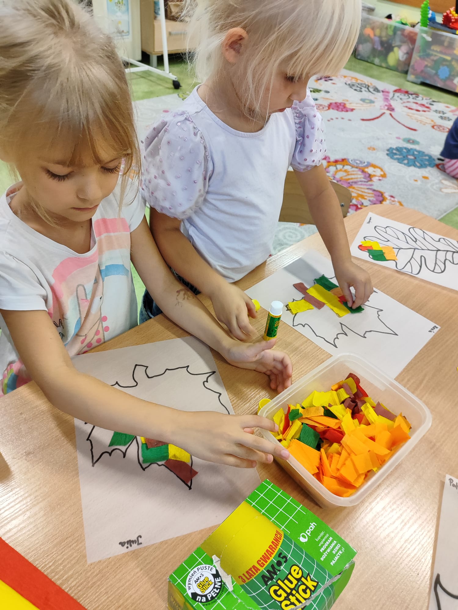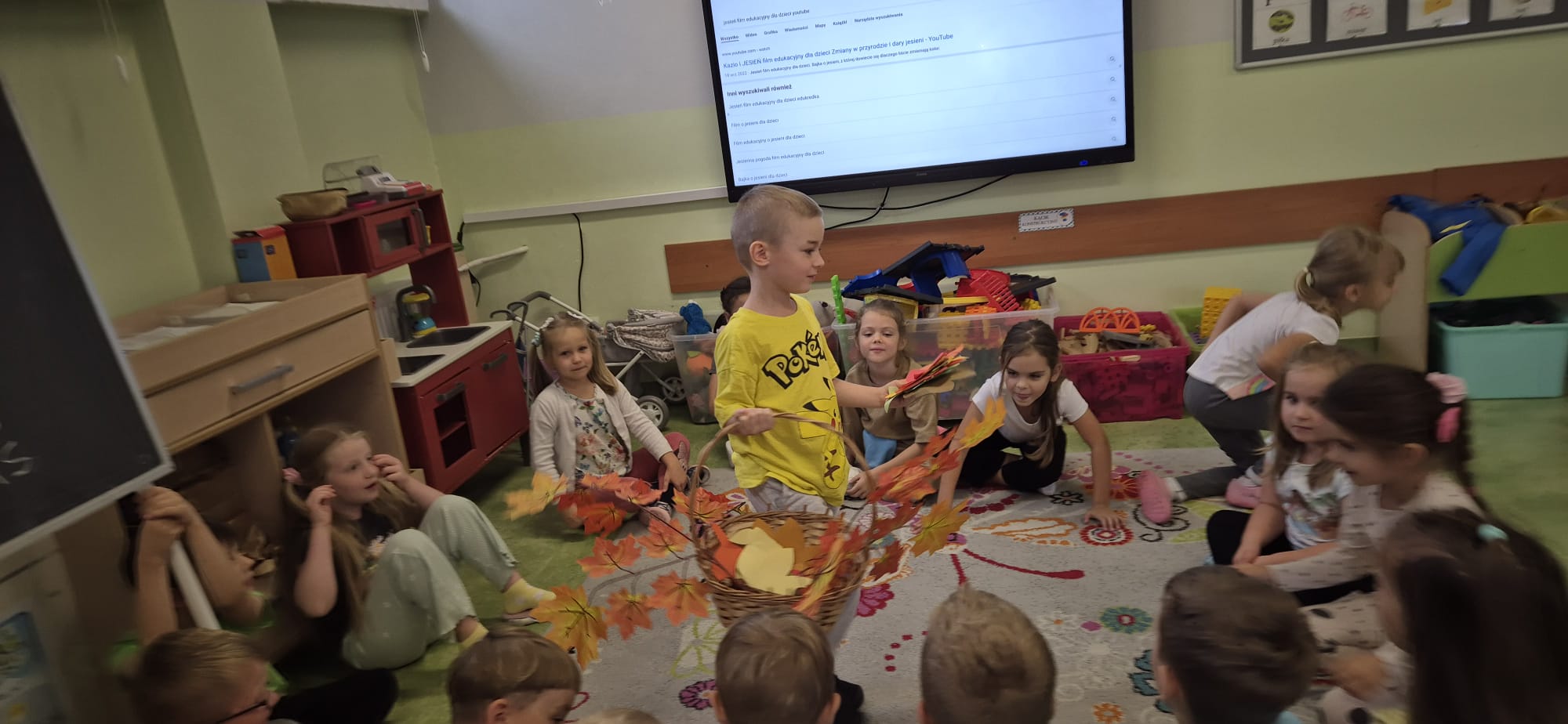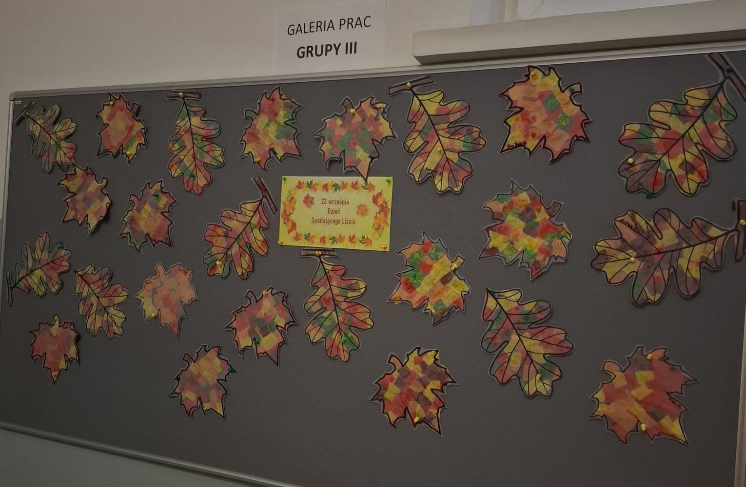 23 września dzieci z grupy trzeciej obchodziły dzień spadającego liścia. W tym dniu dzieci poznawały oznaki nadchodzącej jesieni. Tematyką zajęć był jesienny liść. Dzieci wzięły udział w zabawie podczas której wcieliły się w rolę Pani Jesieni a także podziwiały jesienne liście. Grupa trzecia stworzyła barwne prace plastyczne.