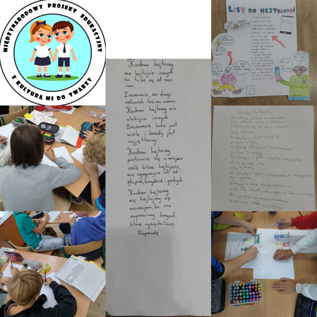 Uczniowie klasy VI b i VI c w ramach Międzynarodowego projektu „Z kulturą mi do twarzy” stworzyli wiersze i plakaty przeciwstawiające się hejtowi, realizując moduł III punkt 27.
