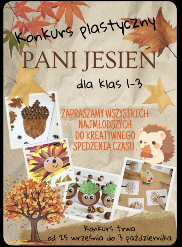 Serdecznie zapraszamy uczniów klas 1-3  do udziału w świetlicowym konkursie plastycznym pt.”Pani Jesień”- przedłużamy termin oddawania prac plastycznych do 09.10.2025. Technika pracy: pastelą, farby, technika łączona , można wykorzystać dary jesieni . Wszystkie prace oddajemy do nauczycielek świetlicy .