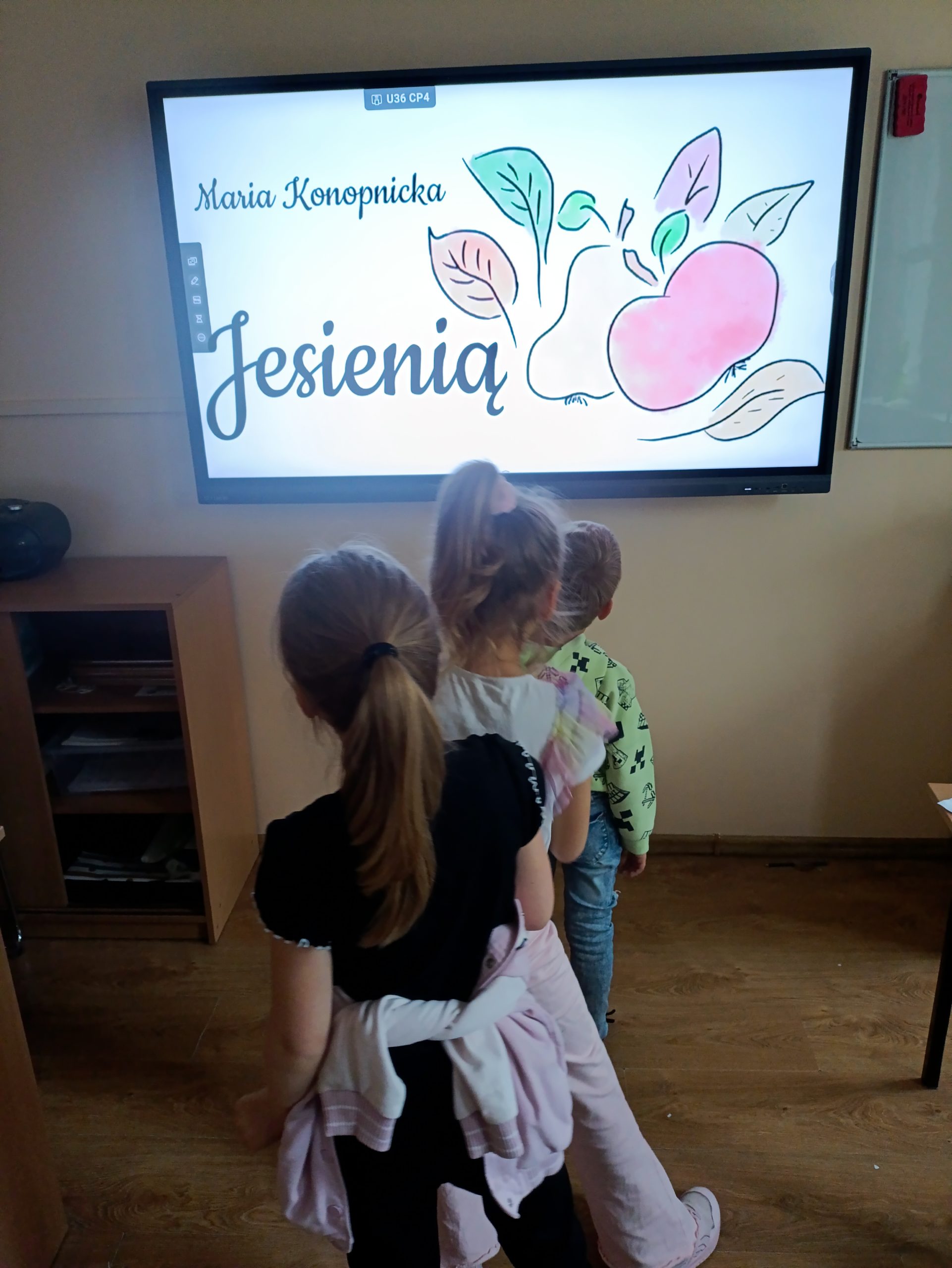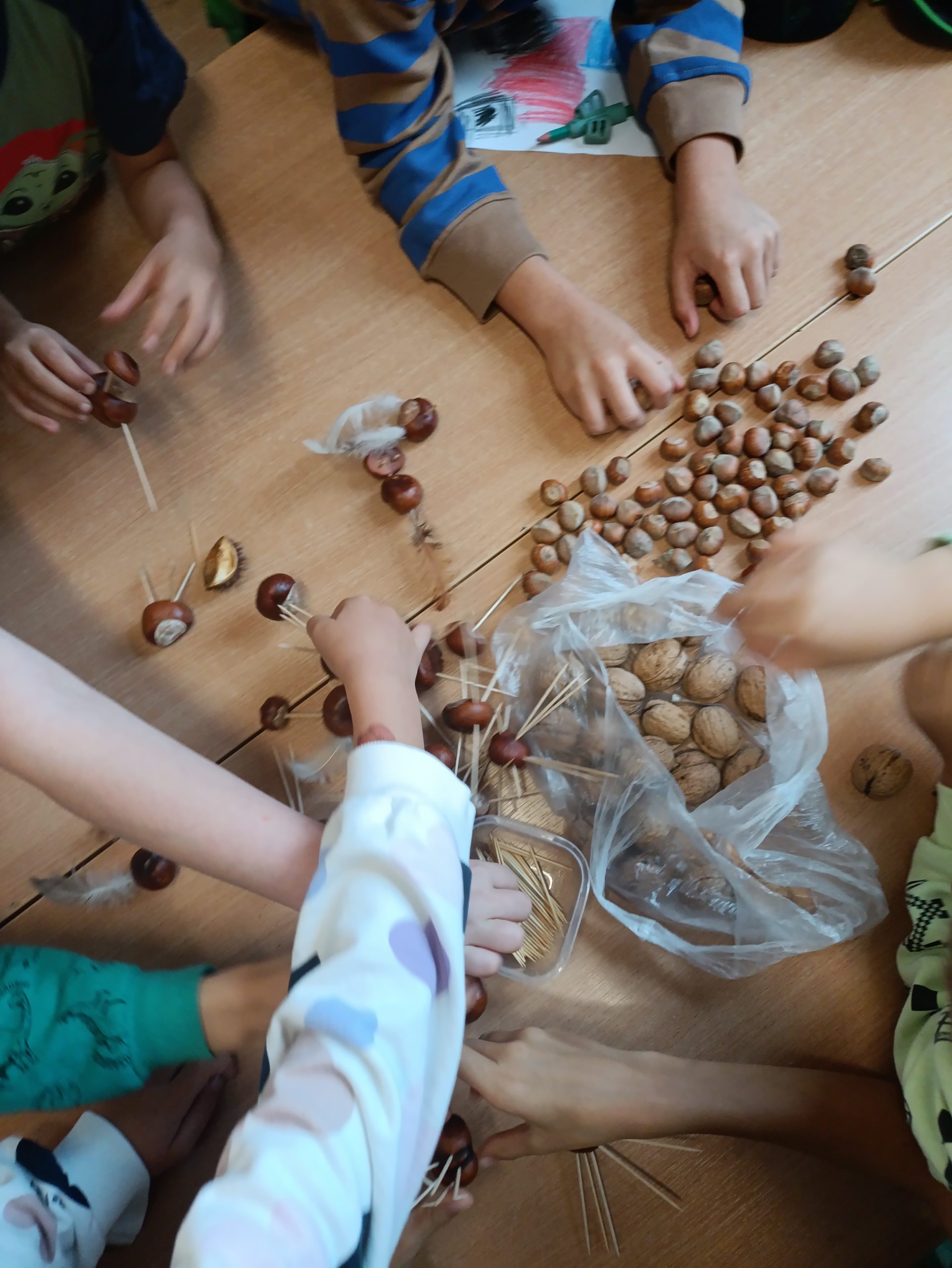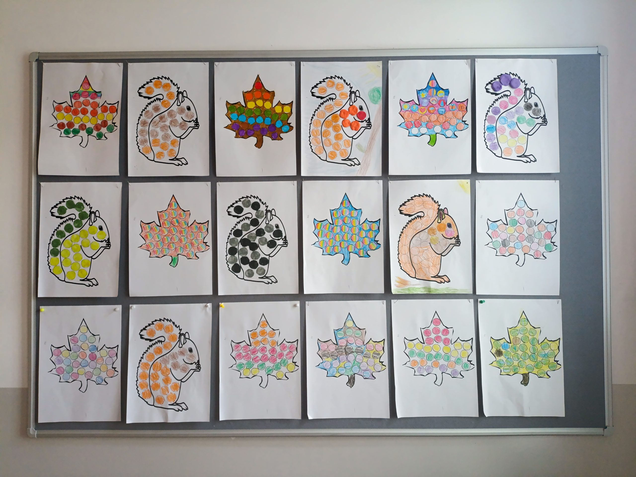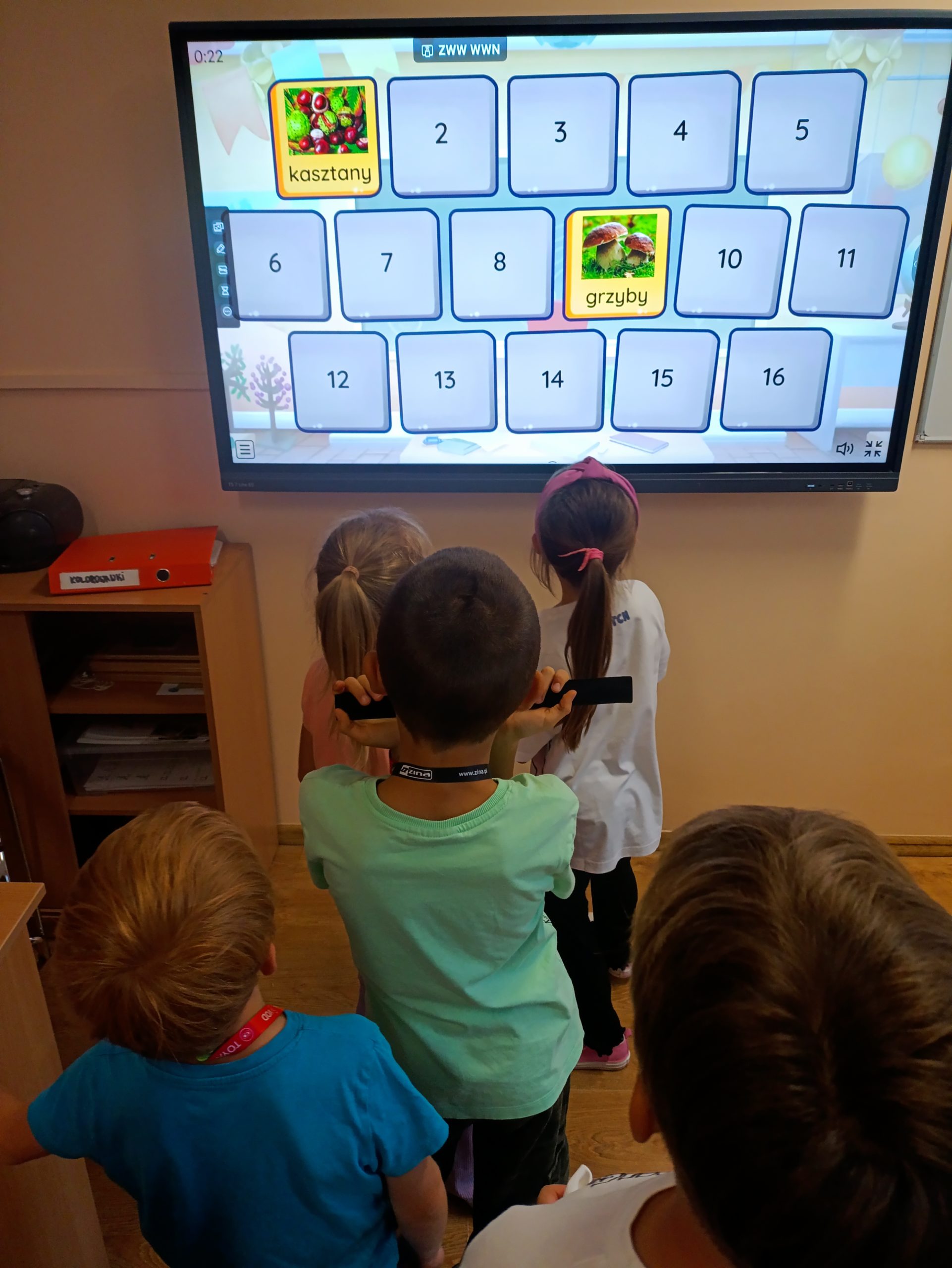 Nie zabrakło też zabawy w segregowanie kasztanów, żołędzi i orzechów – powstały z nich wesołe, jesienne ludziki. 🍄 Dzieci sprawdziły swoją wiedzę, rozwiązując quizy multimedialne o jesieni, dzięki czemu nauka połączyła się z radosną zabawą. 💛