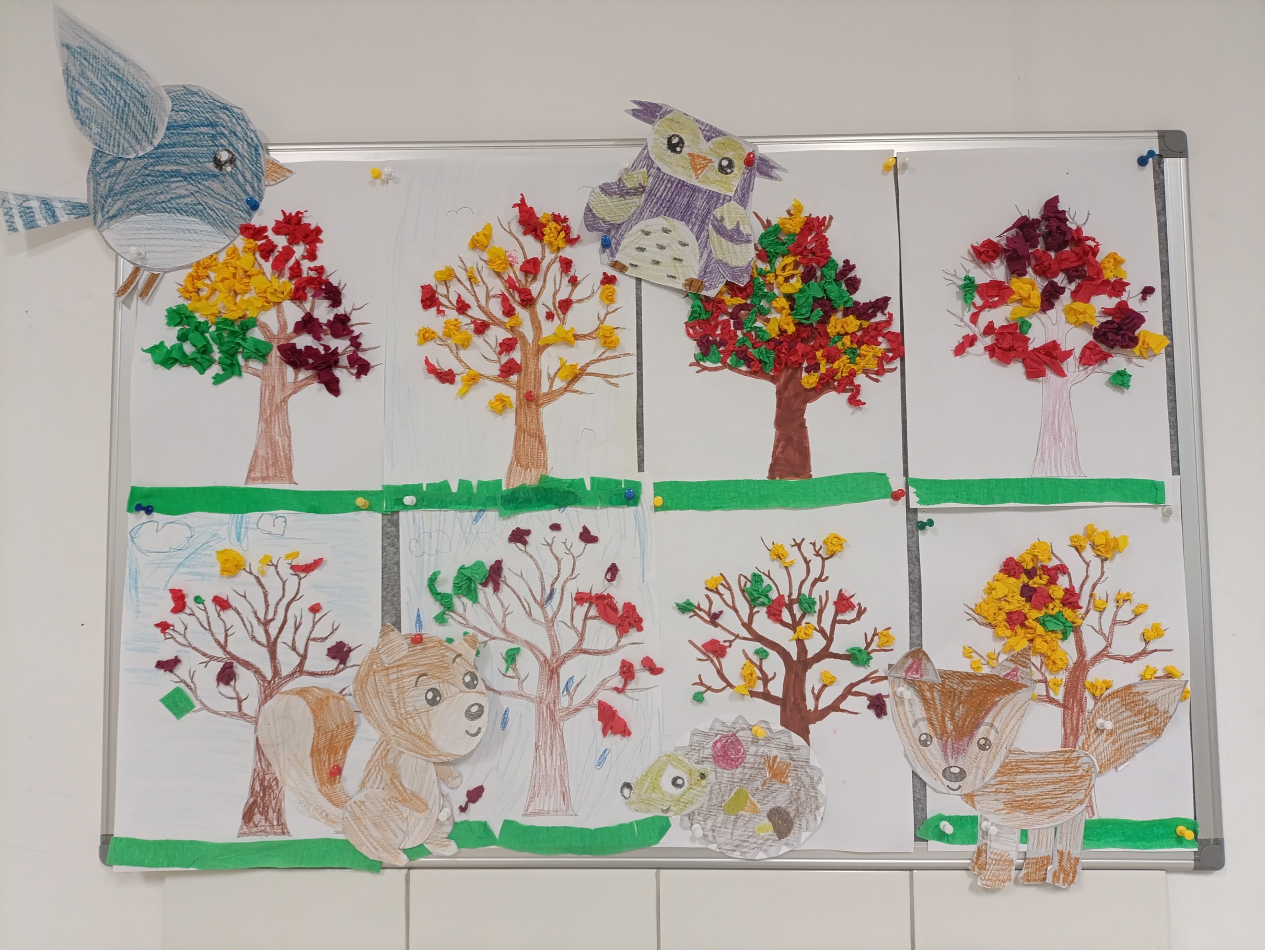 W naszej małej świetlicy dzieci radośnie powitały jesień! Poznały oznaki nadchodzącej pory roku, wysłuchały bajki o jesieni i zebrały liście, które posłużyły im do wykonania pięknych portretów Pani Jesieni. Wspólnie stworzyły też plakat z ogromnym drzewem i kolorowymi liśćmi, a papierowe listki ozdobiły świetlicę i szkolny hol.