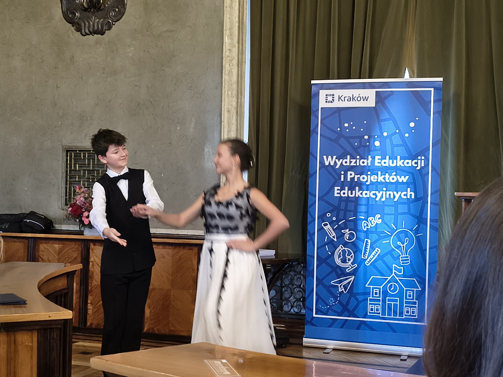 Na zakończenie pragniemy jeszcze dodać, że galę w Urzędzie Miasta Krakowa uświetnił wspaniały pokaz taneczny Ludowego Zespołu Pieśni i Tańca Krakowiak. Polka w wykonaniu Adama Kubatka z kl. 7a (ucznia naszej szkoły) oraz Zuzanny Kumorek była pięknym i wzruszającym akcentem.