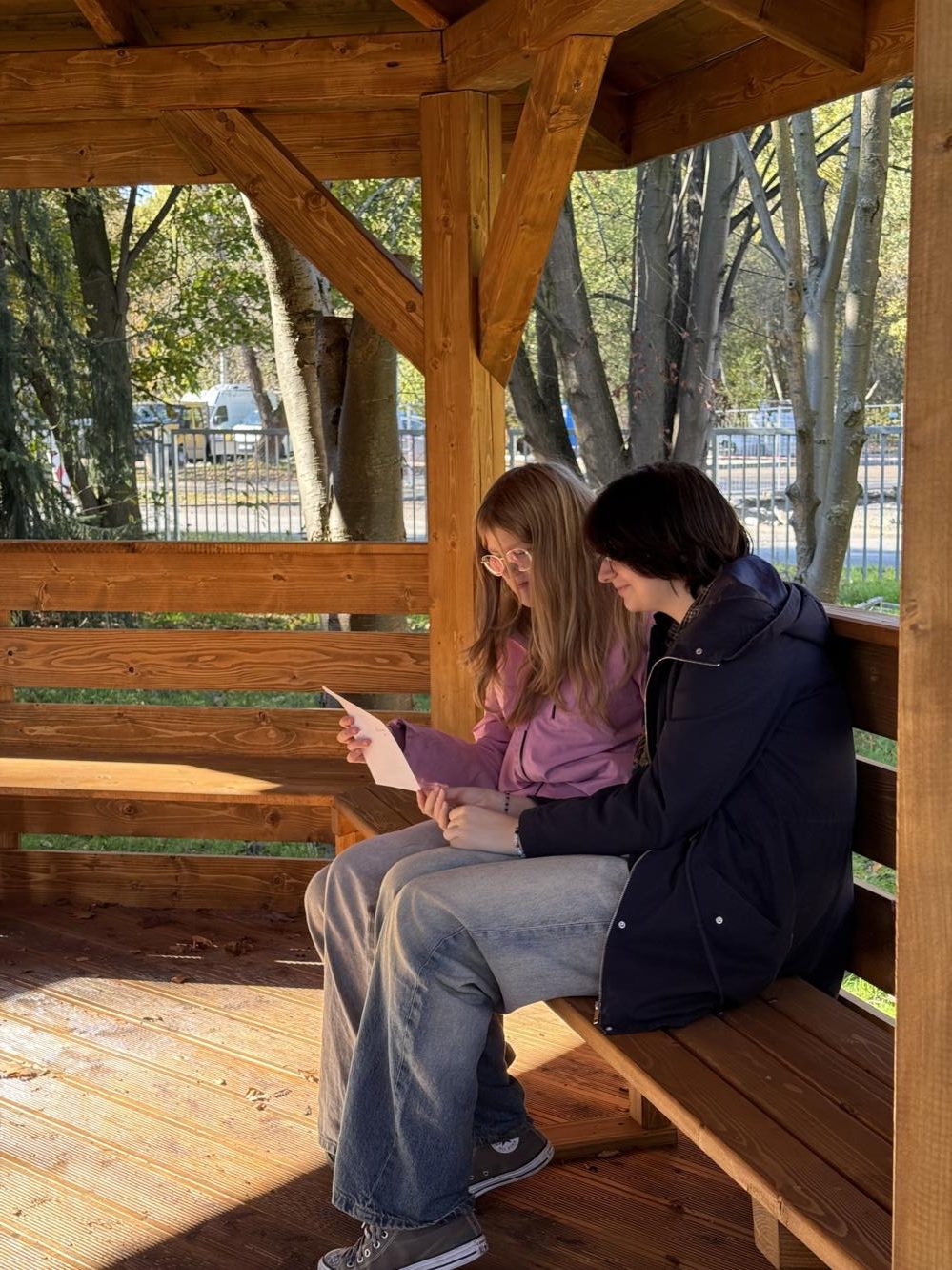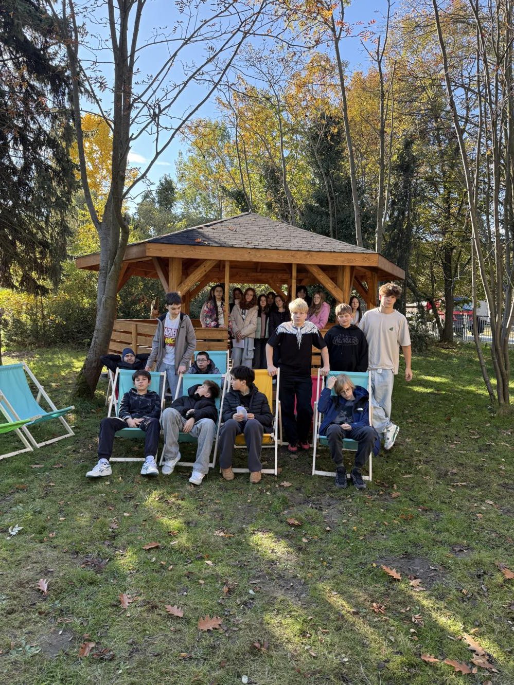 Piękna altana – idealne miejsce na zajęcia plenerowe i spotkania. Dzięki niej lekcje mogą teraz odbywać się na świeżym powietrzu, w otoczeniu zieleni.