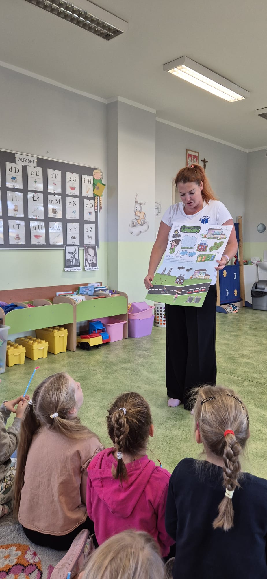 27 października pięciolatki i sześciolatki z naszego przedszkola wzięły udział w akcji zdrowie na 5+. Celem akcji jest propagowanie zdrowego trybu życia i aktywności fizycznej wśród najmłodszych. Nasze przedszkole odwiedziła fizjoterapeutka z Uzdrowiska Kopalnia Soli ,, Wieliczka”, która przeprowadziła zajęcia z przedszkolakami. Podczas zajęć dzieci Pani prowadząca przeprowadziła krótką pogadankę na temat układu oddechowego i alergii. Dzieci wzięły udział w grze memory na temat czystego powietrza, wykonywały ćwiczenia fizyczne i oddechowe. Na pamiątkę spotkania dzieci otrzymały prezenty odblaski, naklejki i karty pracy dotyczące czystego powietrza.