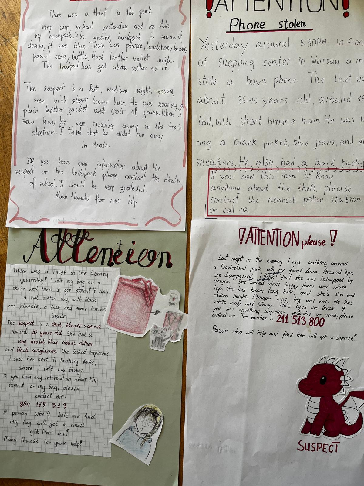 Klasy 7 wzięły na warsztat różne tematy, ulubione filmy były jednym z nich. The Film I Like. Siódmoklasiści z klasy 7b trenowali również pisanie ogłoszenia, jednej z form egzaminacyjnych. Tym razem szukano zagubionych przedmiotów. Lost and Found.