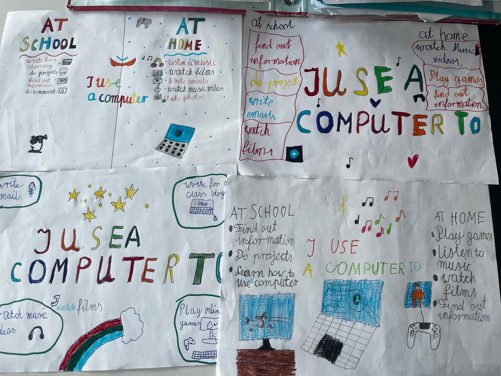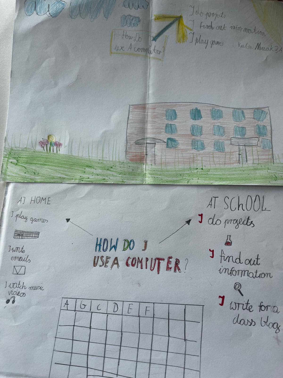 Klasy 3 b i 3d pracowały nad projektem naukowym na temat zastosowania komputerów jako narzędzie do zabawy, nauki i pracy. Zwieńczeniem ich pracy były plakaty pt: I use a computer to….