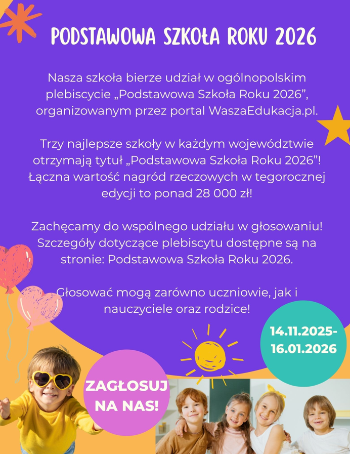 Z przyjemnością informujemy, że nasza szkoła bierze udział w ogólnopolskim plebiscycie „Podstawowa Szkoła Roku 2026”, organizowanym przez portal WaszaEdukacja.pl.