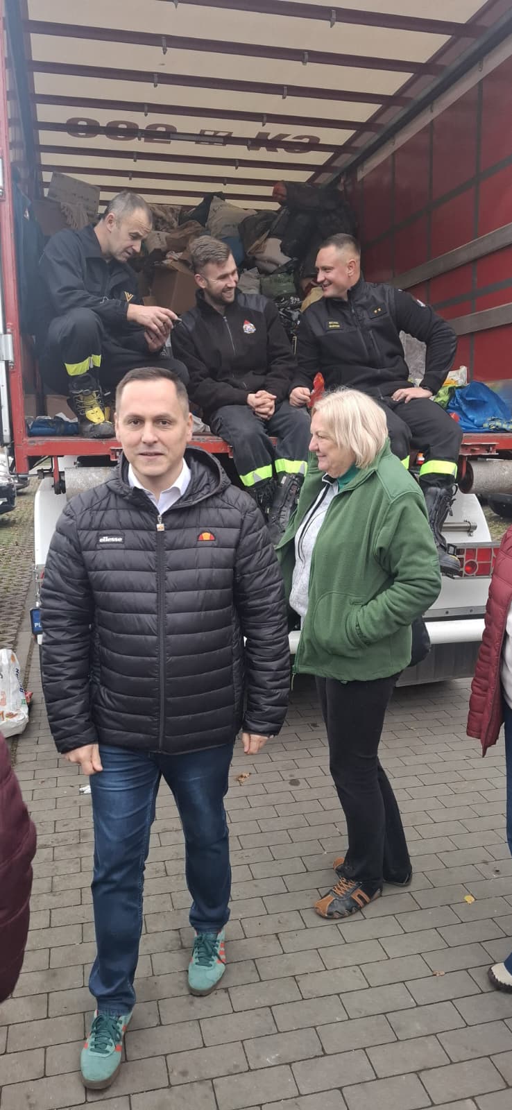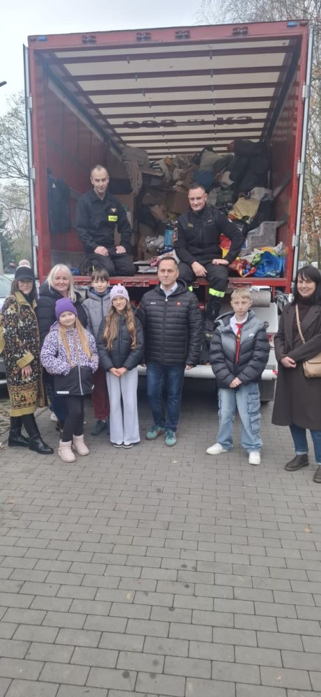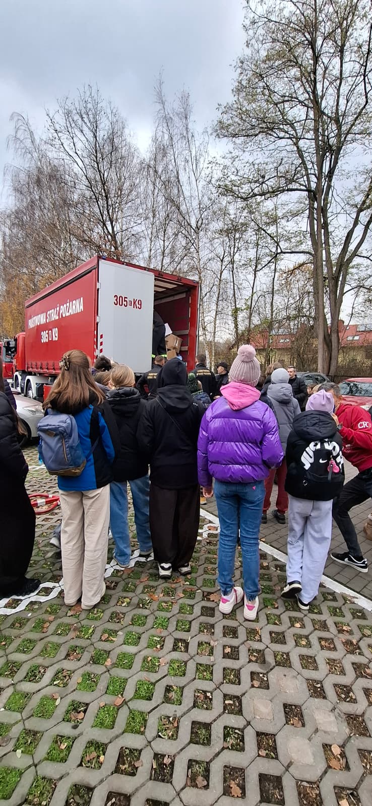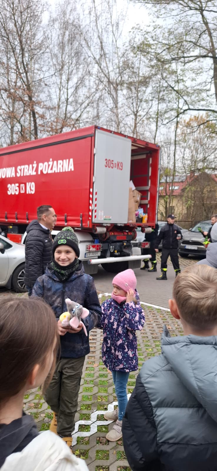 Przez ponad godzinę, wspólnie z p. przewodniczącym R.M.K., rodzicami, uczniami oraz strażakami z Komendy Miejskiej Państwowej Straży Pożarnej w Krakowie, rozładowywaliśmy kolejne kartony, worki i paczki.
