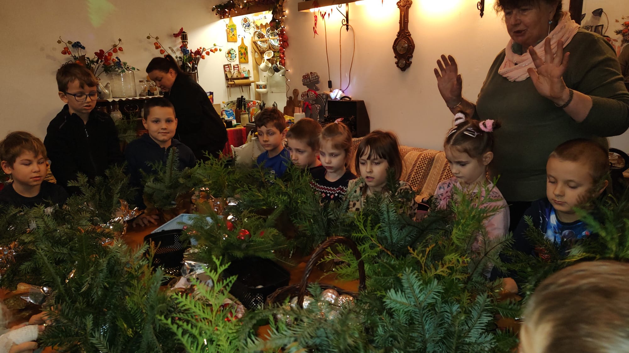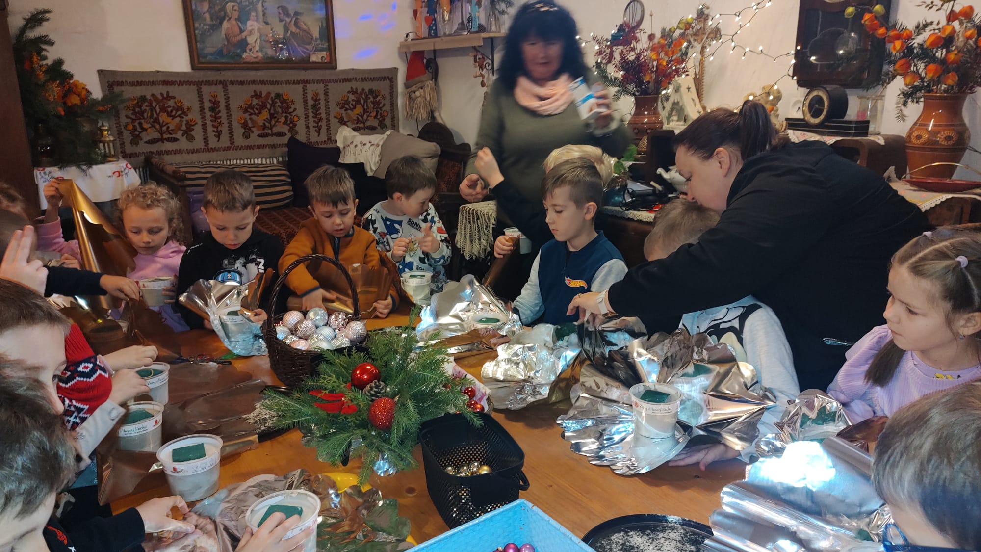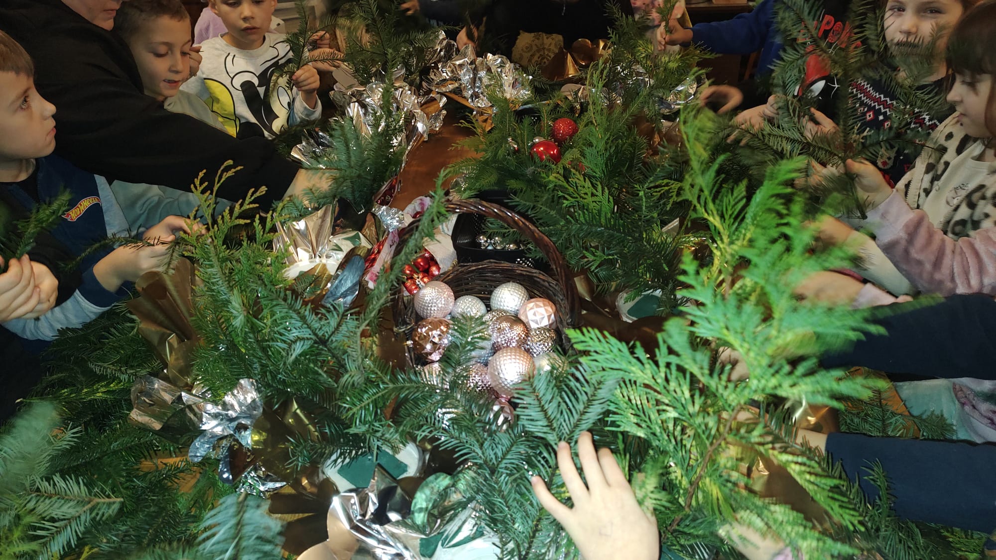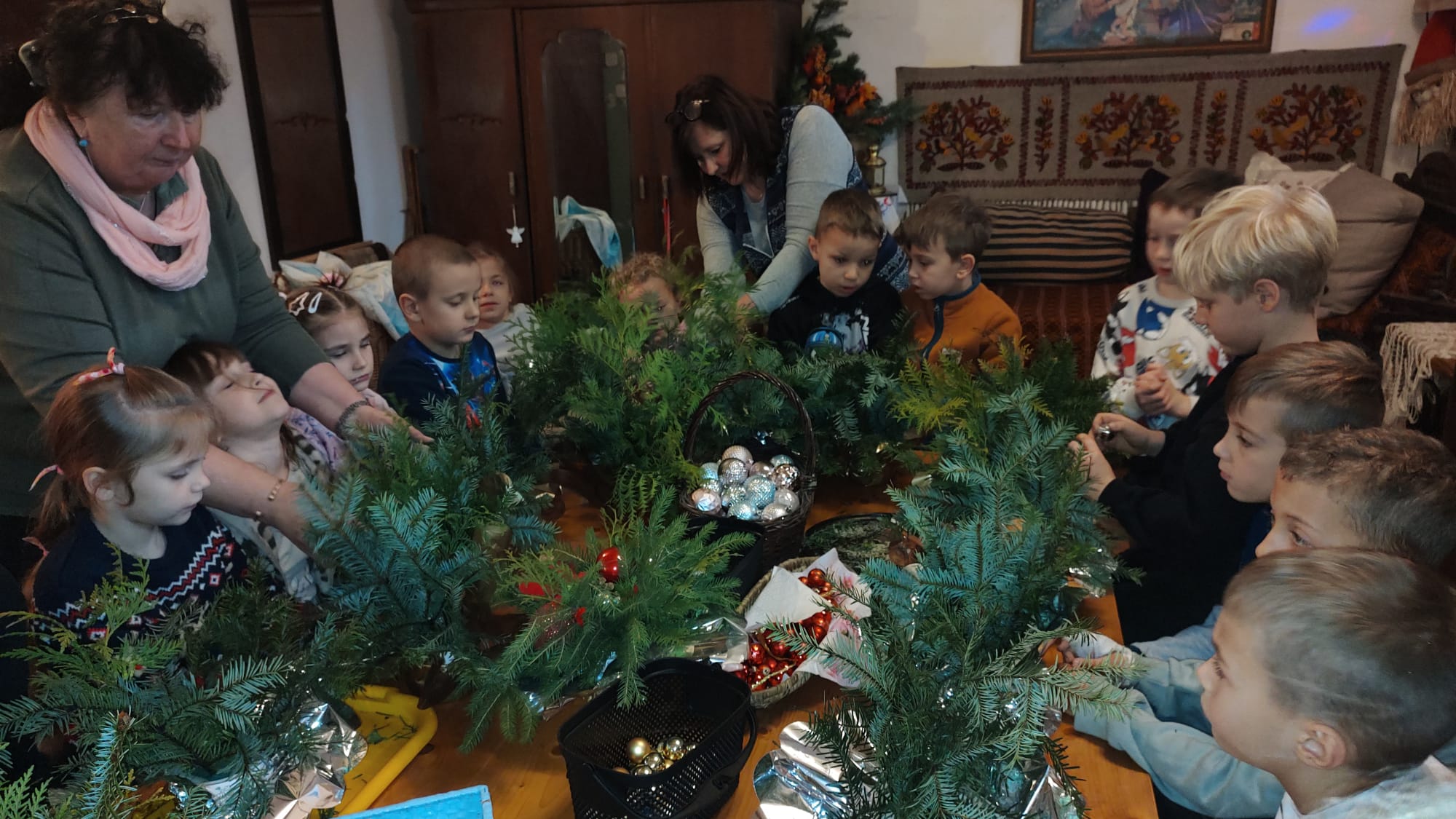 Podczas warsztatów w Bogdanówce tworzyliśmy kolorowe stroiki – było dużo śmiechu, pomysłów i gałązek igliwia wszędzie dookoła.