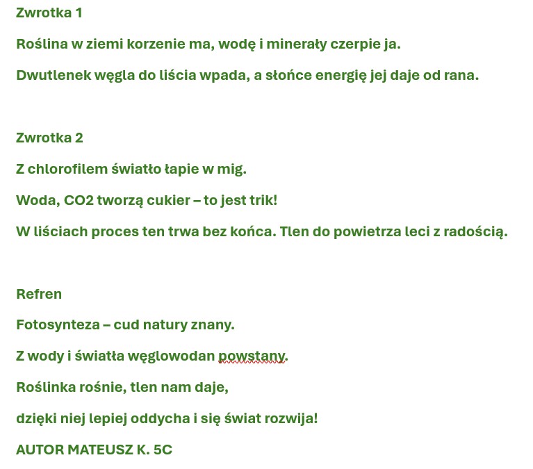 Szczególnym przykładem twórczej pracy był Mateusz, który samodzielnie napisał piosenkę o fotosyntezie. W swoim utworze w przystępny i pomysłowy sposób przedstawił proces wytwarzania pokarmu przez rośliny, znaczenie światła słonecznego, wody i dwutlenku węgla oraz rolę tlenu dla organizmów żywych. Piosenka łączyła treści przyrodnicze z muzyką, wspierając naukę poprzez twórcze działanie i prezentację własnych pomysłów.