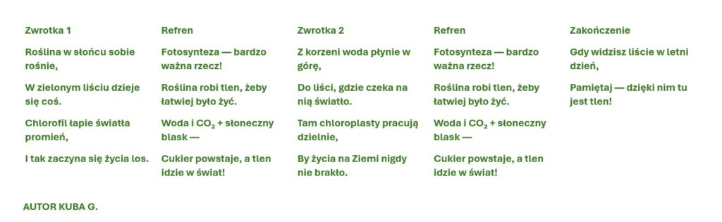 Dzięki ich kreatywności utrwaliliśmy wiedzę o procesie, który dzieje się po cichu w komórkach roślin – dając im pokarm, a nam bezcenny tlen. Brawo za odwagę i pokazanie, że nauka może mieć niesamowity rytm!