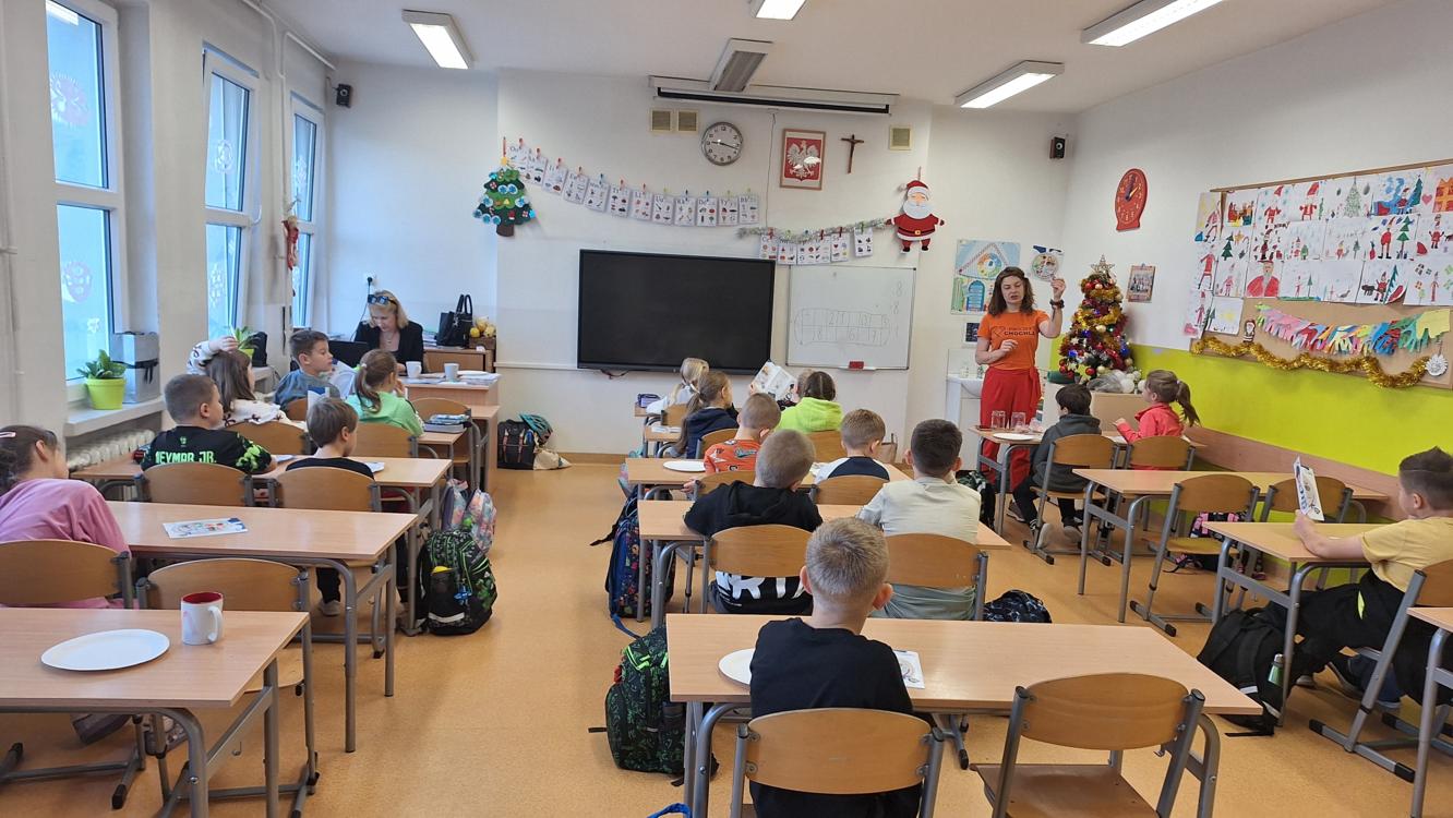 10 grudnia klasy 2a, 2d oraz 3a wzięły udział w  warsztatach poświęconych znaczeniu prawidłowego nawodnienia oraz zasadom komponowania zdrowego talerza. Zajęcia były świetną zabawą — uczniowie poprzez aktywne zadania i ciekawe pokazy poznawali, jak ważne jest picie wody każdego dnia oraz jakie produkty powinny znaleźć się w codziennych posiłkach. Warsztaty przebiegły w radosnej i angażującej atmosferze, zachęcając dzieci do świadomego dbania o zdrowie.