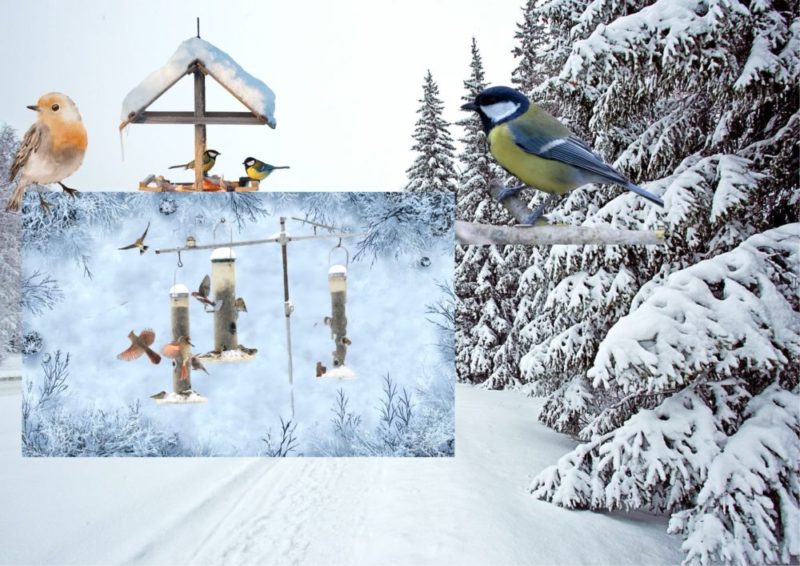 Karmnik dla ptaków wykonany z 5-litrowej butelki po wodzie mineralnej. Wykonywanie takiego karmnika jest bardzo proste. Wystarczy ostrymi nożyczkami wyciąć otwory. Następnie na sznurek zawiesić „daszek” dla ptaków, a sznurek zakręcić nad szyjką do karmnika, aby ziarno nie wypadało. Rozsypane nasiona można wsypać do karmnika. Karmnik zawiesiłem na gałęzi drzewa obok okna, dzięki czemu z domu można było obserwować ptaki. Po kilku dniach zauważyłem pierwszych gości w karmniku. Były to małe ptaki. Przylatywały wróble oraz sikorki. Czasami do karmnika przylatywały też wrony oraz gołębie.