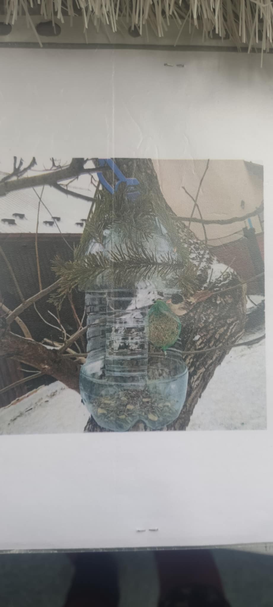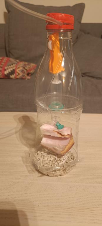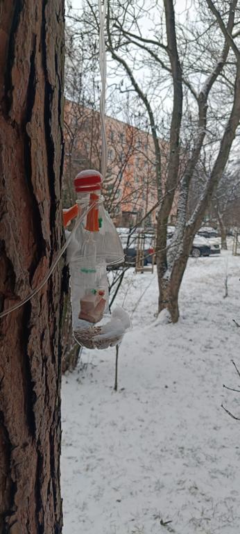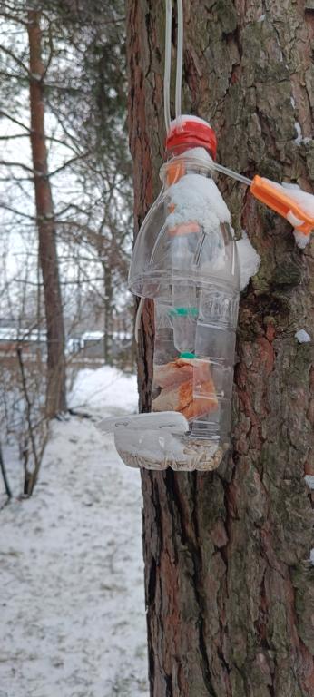 Karmnik dla ptaków wykonany z 5-litrowej butelki po wodzie mineralnej. Wykonywanie takiego karmnika jest bardzo proste. Wystarczy ostrymi nożyczkami wyciąć otwory. Następnie na sznurek zawiesić „daszek” dla ptaków, a sznurek zakręcić nad szyjką do karmnika, aby ziarno nie wypadało. Rozsypane nasiona można wsypać do karmnika. Karmnik zawiesiłem na gałęzi drzewa obok okna, dzięki czemu z domu można było obserwować ptaki. Po kilku dniach zauważyłem pierwszych gości w karmniku. Były to małe ptaki. Przylatywały wróble oraz sikorki. Czasami do karmnika przylatywały też wrony oraz gołębie.