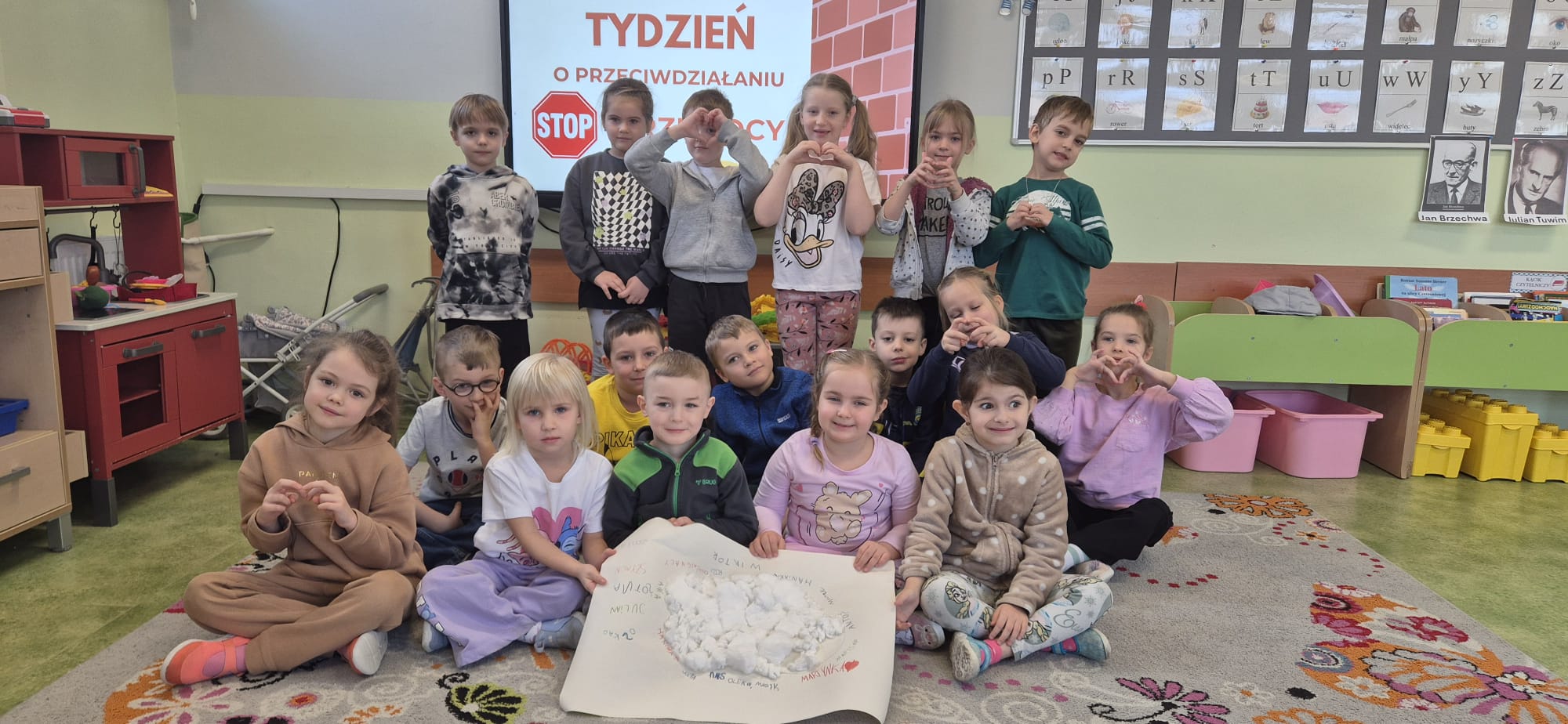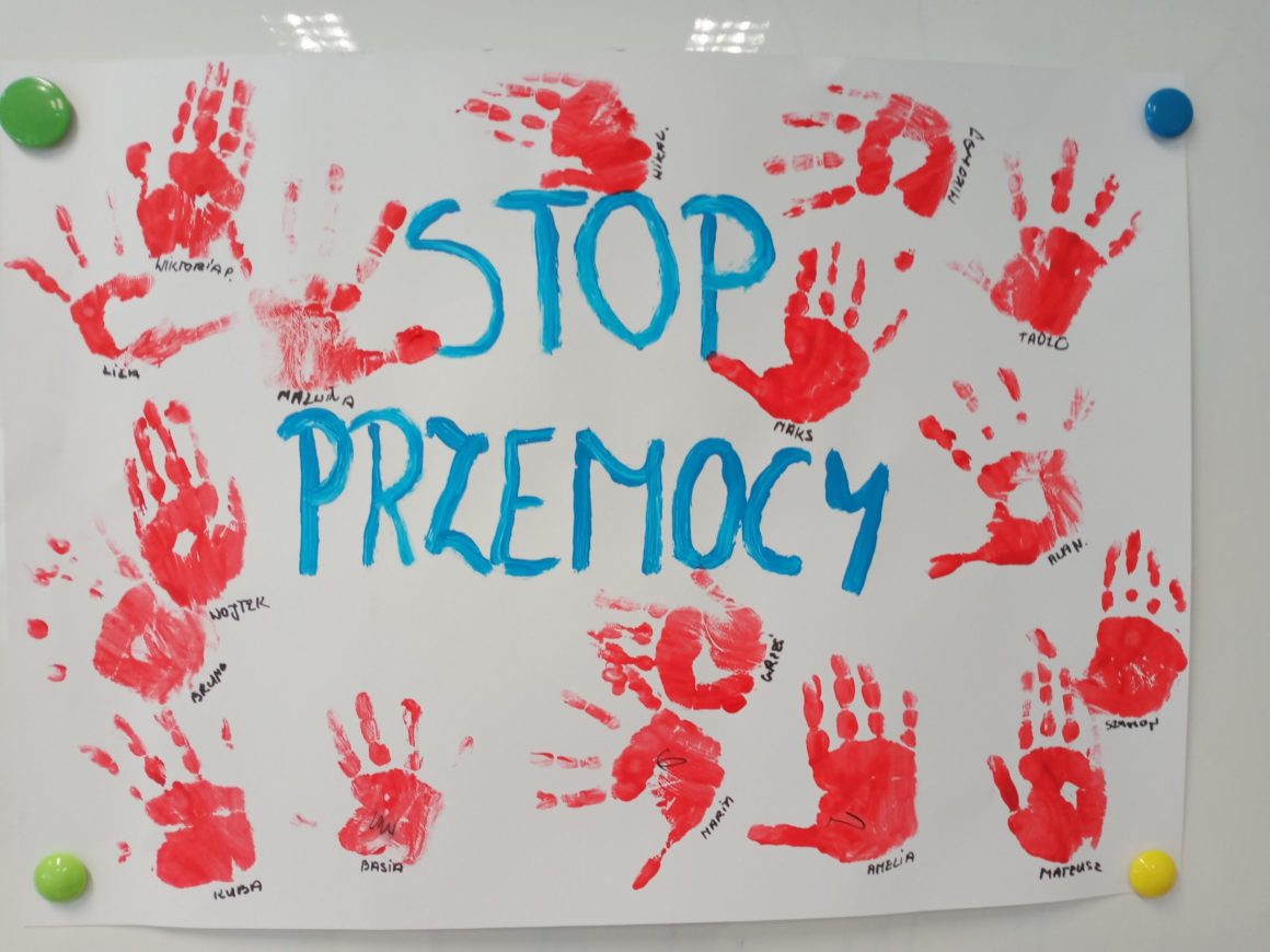 Od 19 do 24 stycznia w naszym przedszkolu odbywał się tydzień przeciwdziałania przemocy. W tygodniu tym dzieci wysłuchały opowiadań poruszających temat przemocy na podstawie utworów o jeżyku Roro oraz ,,O puchatym i kolczatym”. We wtorek na znak przeciwstawieniu się przemocy dzieci z naszego przedszkola ubrały się na biało. Dzieci przypominały sobie również kodeks zasad grupowych, rozmawiały o uczuciach i emocjach. Wykonały prace plastyczne do słuchanych utworów oraz plakat ,,stop przemocy”. W tym tygodniu każdą z grup odwiedziła pani pedagog specjalny Magdalena Majcher i przeprowadziła zajęcia na temat przeciwdziałania przemocy.