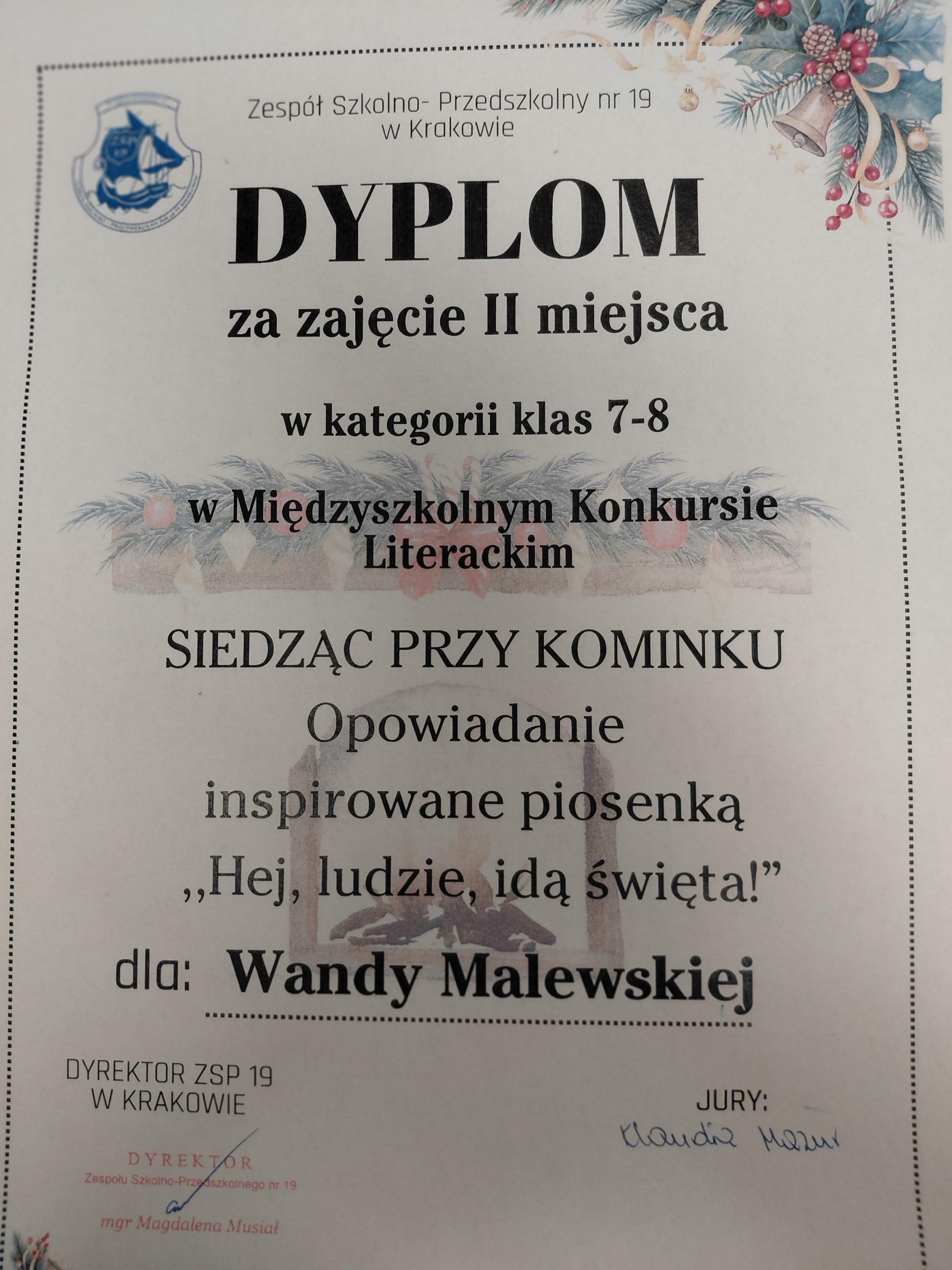Z dumą informujemy, iż Wanda Malewska z kl. 7b zajęła drugie miejsce w Międzyszkolnym Konkursie Literackim „Siedząc przy kominku”! Był to konkurs na opowiadanie inspirowane piosenką Jacka Cygana – ,,Hej, ludzie, idą święta!“, zorganizowany przez Szkołę Podstawowa nr 117 w Krakowie.