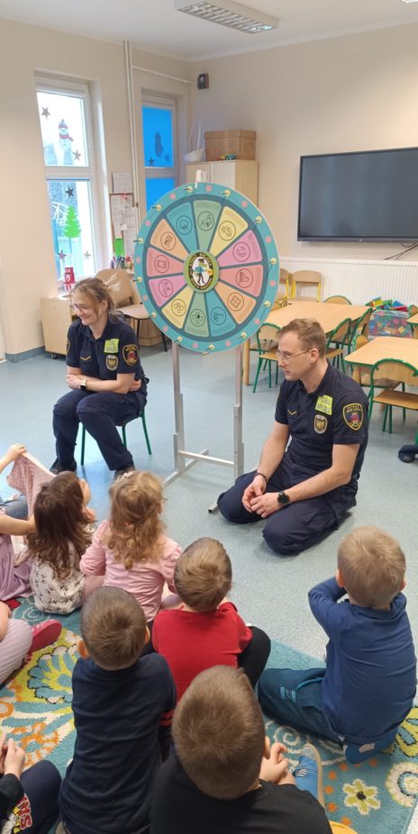 12 lutego nasze przedszkole odwiedziła straż miejska. Strażacy przeprowadzili z dziećmi pogadankę na temat bezpieczeństwa. Prowadzący przynieśli ze sobą ciekawy rekwizyt – koło fortuny. Zabawa polegała na losowaniu symbolu i omawianiu bezpiecznych i niebezpiecznych zachowań. Dzieci opowiadały jak bezpiecznie zachować się na lodowisku, w kontakcie z psem, prądem, ogniem, podczas burzy. Przedszkolaki powtórzyły znajomość numerów alarmowych.