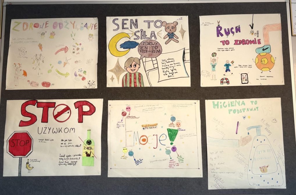 Na lekcjach edukacji zdrowotnej uczniowie klas 6C i 6D zamienili się w prawdziwych ekspertów od zdrowia! Przygotowali kolorowe i pomysłowe plakaty, na których pokazali, jak dbać o siebie na co dzień. Nie zabrakło tematów takich jak: zdrowy sen 💤, dobre odżywianie 🥗, aktywność fizyczna 🏃‍♀️, higiena 🧼 oraz emocje 💬❤️.
