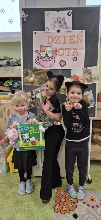 17 lutego obchodzimy dzień kota. Z tej okazji dzieci przyszły do przedszkola przebrane za kotki, przyniosły swoje maskotki oraz książki na temat kotków. Podczas zajęć dzieci uczestniczyły w różnych zabawach ruchowych, rozwiązywały zagadki o kotach, uzupełniały karty pracy. Dzieci stworzyły piękne prace plastyczne o kotach.