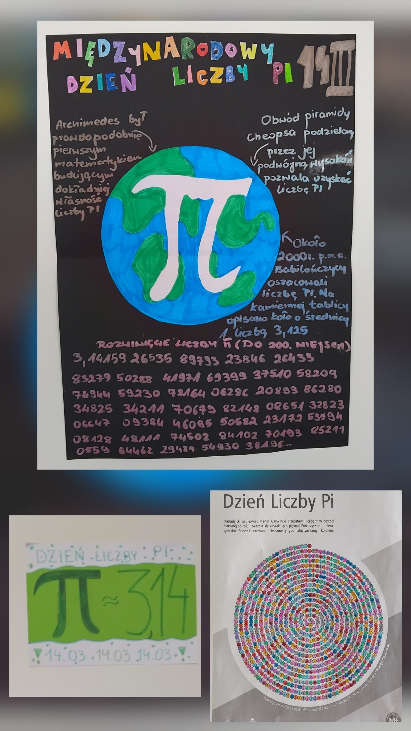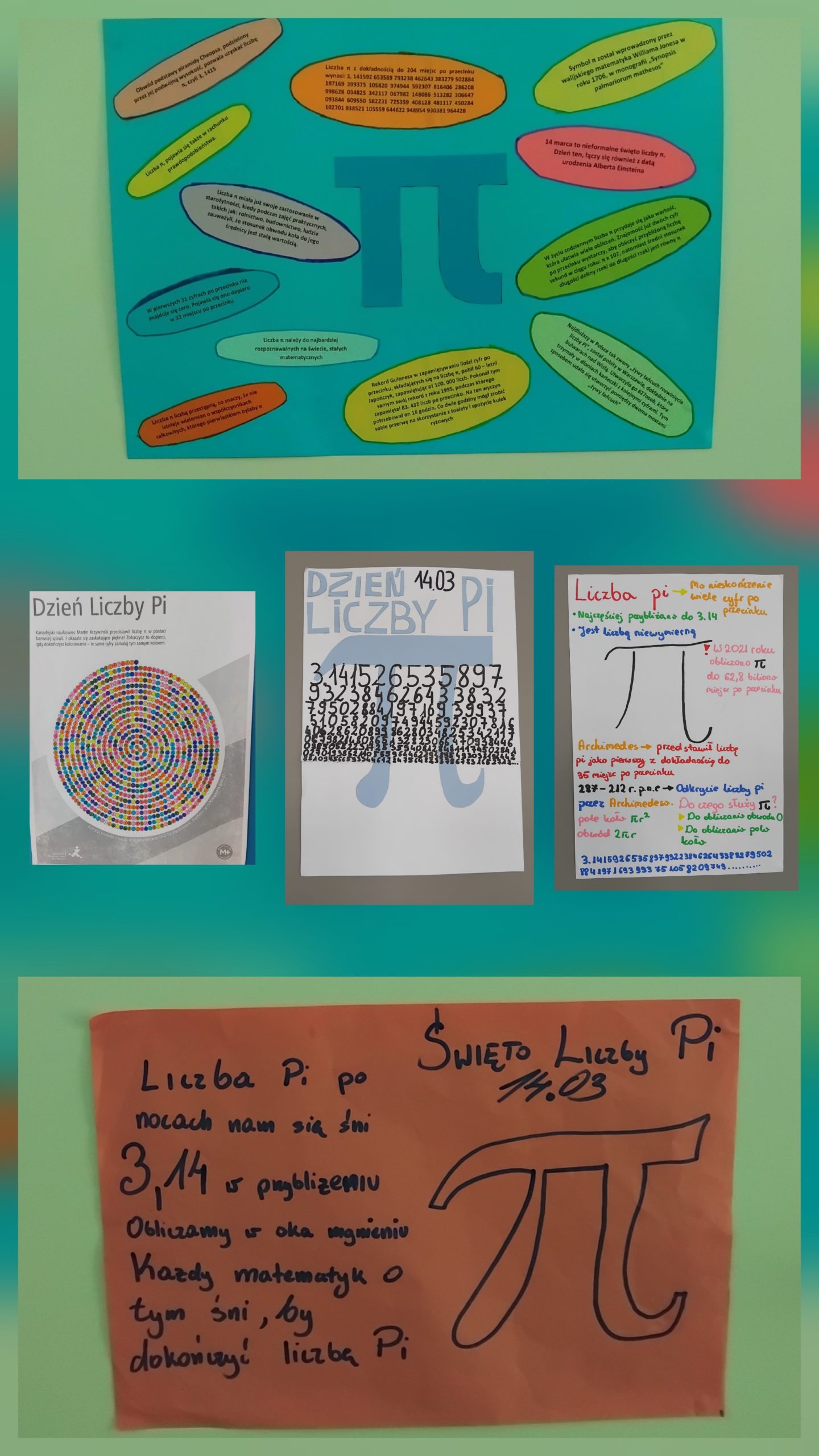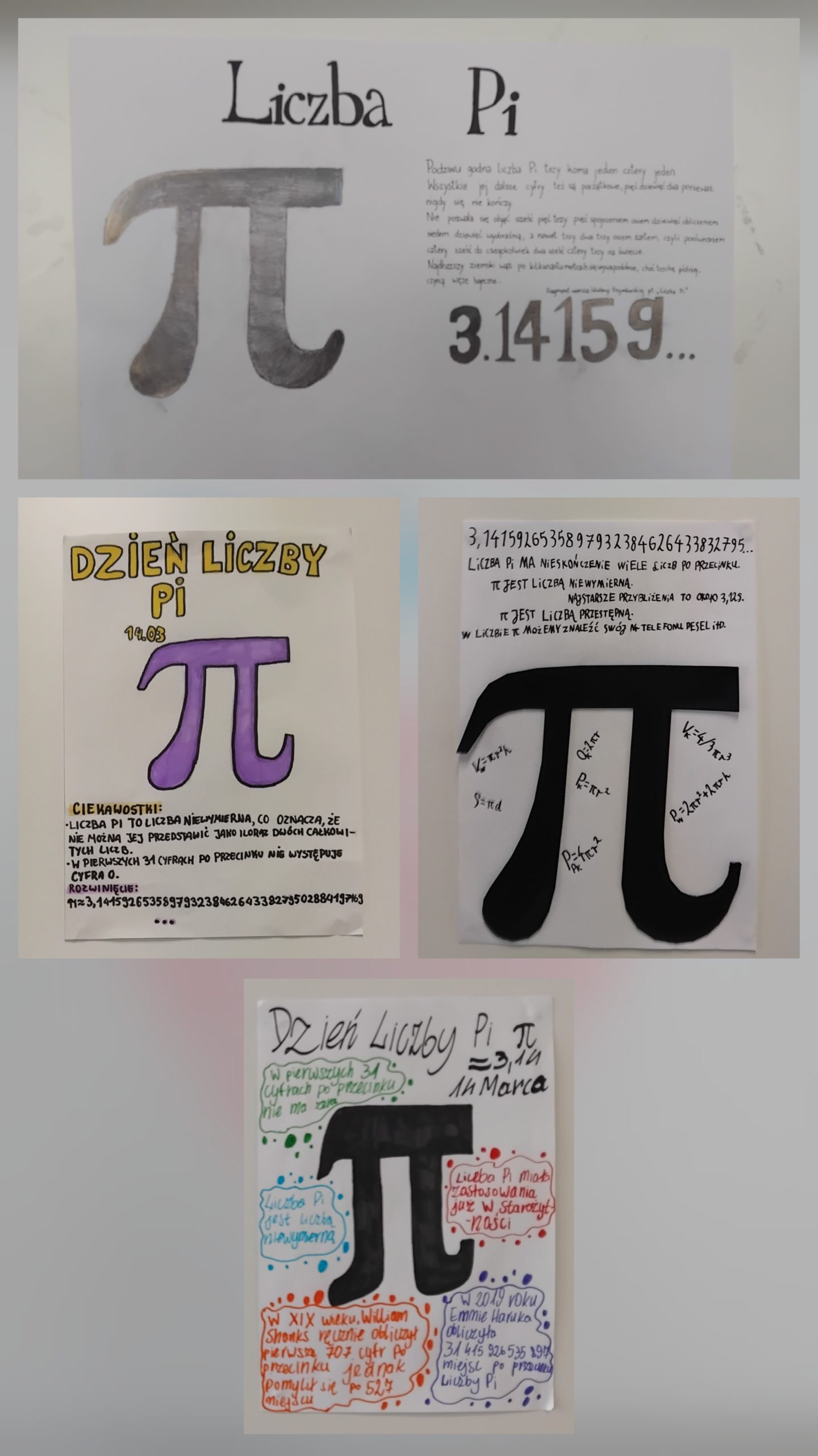 Na korytarzach pojawiły się prace uczniów klasy 8a, dzięki którym uczniowie innych klas mogą poznać historię powstania liczby Pi i ciekawostki z nią związane.