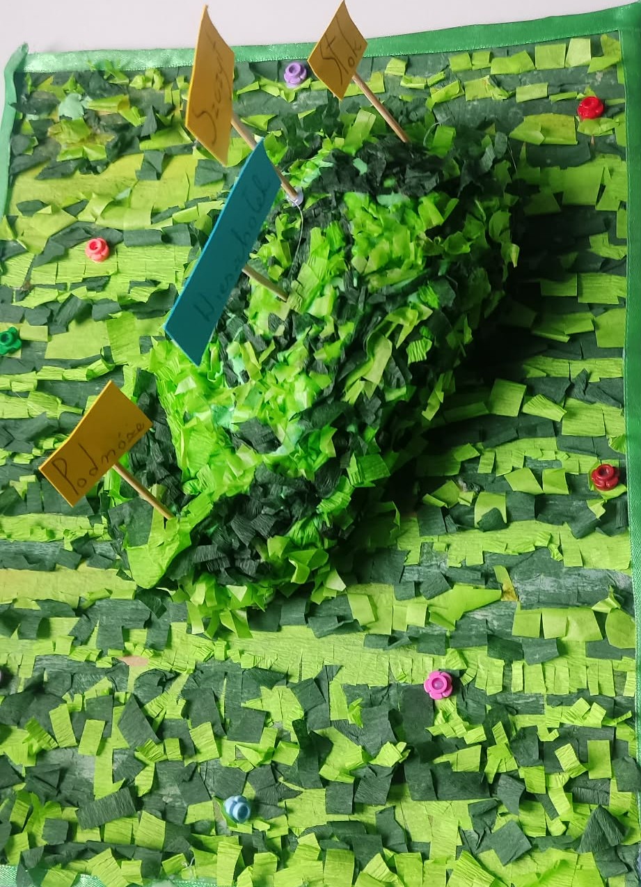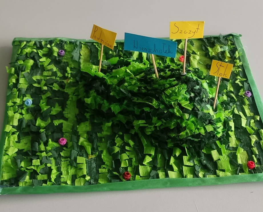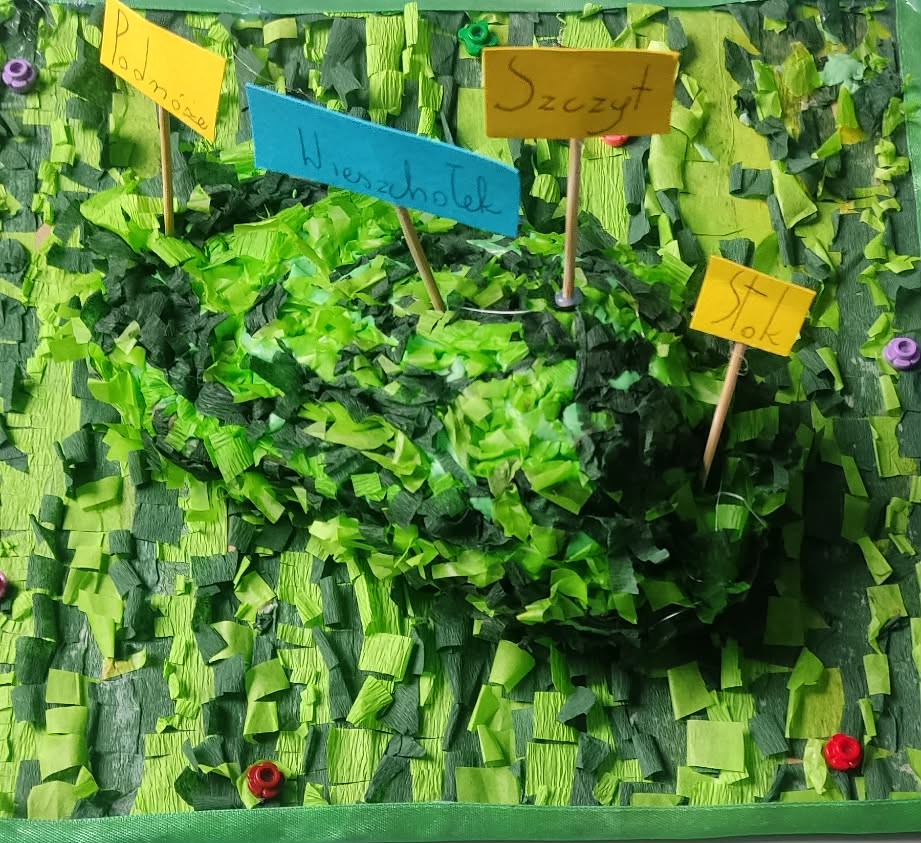 Tę właśnie zewnętrzną budowę wzniesienia w ciekawy sposób przedstawiła w swoim modelu Maja z klasy 4b. Na jej pracy można wyraźnie zobaczyć najważniejsze elementy: szczyt, stoki oraz podnóże.
