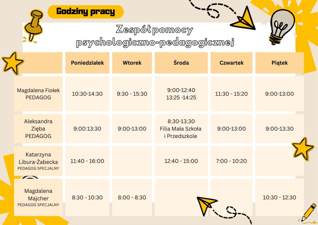 Naszym zadaniem jest poznanie indywidualnych potrzeb uczniów, analizowanie przyczyn niepowodzeń szkolnych oraz organizowanie i prowadzenie różnych form pomocy i wsparcia psychologiczno-pedagogicznego dla uczniów, rodziców i nauczycieli.